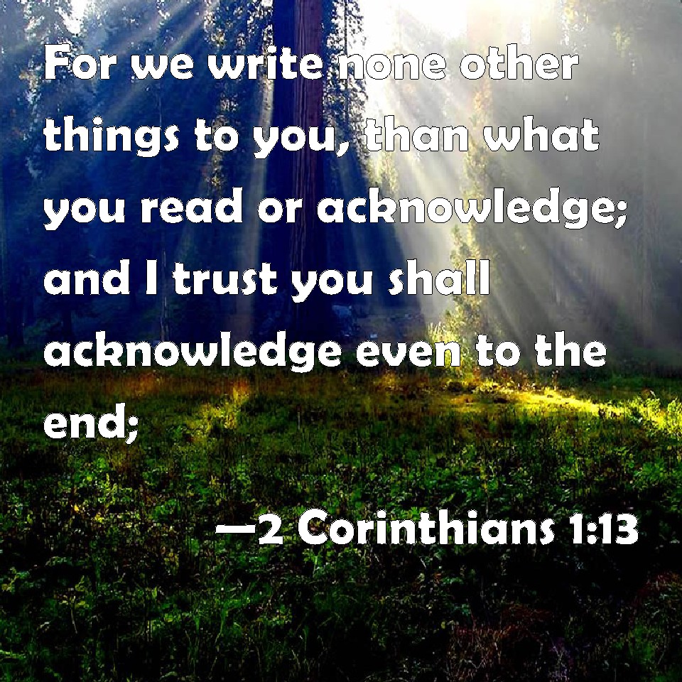 Choose a Background 2 Corinthians 1:13 For we write none other things to you, than what you read or acknowledge; and I trust you shall acknowledge even to the end; KJV: For we write none other things unto you, than what ye read or acknowledge; and I trust ye shall acknowledge even to the end; DRB: For we write no other things to you than what you have read and known. And I hope that you shall know unto the end: DBT: For we do not write other things to you but what ye well know and recognise; and I hope that ye will recognise to the end, ERV: For we write none other things unto you, than what ye read or even acknowledge, and I hope ye will acknowledge unto the end: WBT: For we write no other things to you, than what ye read or acknowledge; and I trust ye will acknowledge even to the end; WEB: For we write no other things to you, than what you read or even acknowledge, and I hope you will acknowledge to the end; YLT: for no other things do we write to you, but what ye either do read or also acknowledge, and I hope that also unto the end ye shall acknowledge,Links 2 Corinthians 1:13 NIV • 2 Corinthians 1:13 NLT • 2 Corinthians 1:13 ESV • 2 Corinthians 1:13 NASB • 2 Corinthians 1:13 KJV • 2 Corinthians 1:13 Interlinear • 2 Corinthians 1:13 Commentaries • 2 Corinthians 1:13 Parallel Texts • 2 Corinthians 1:13 Bible Apps • 2 Corinthians 1:13 Parallel • Bible Hub |