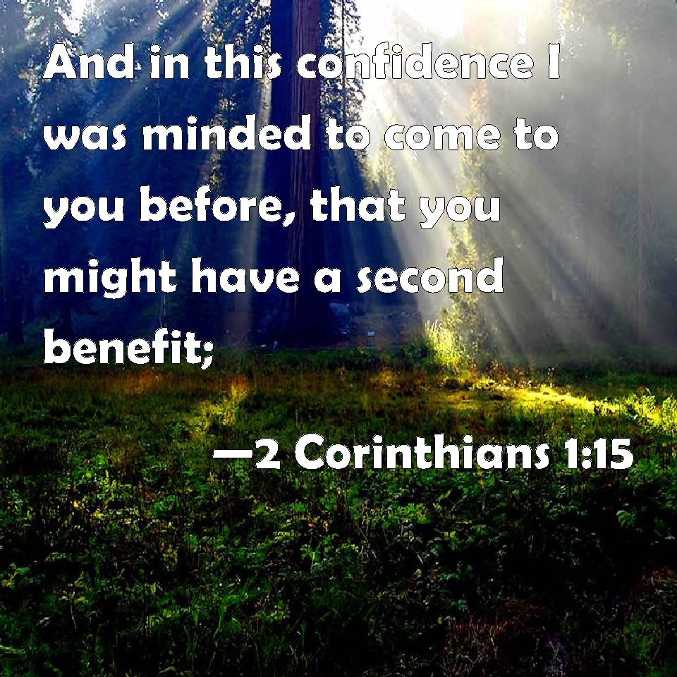 Choose a Background 2 Corinthians 1:15 And in this confidence I was minded to come to you before, that you might have a second benefit; KJV: And in this confidence I was minded to come unto you before, that ye might have a second benefit; DRB: And in this confidence I had a mind to come to you before, that you might have a second grace: DBT: And with this confidence I purposed to come to you previously, that ye might have a second favour; ERV: And in this confidence I was minded to come before unto you, that ye might have a second benefit; WBT: And in this confidence I purposed to come to you before, that ye might have a second benefit; WEB: In this confidence, I was determined to come first to you, that you might have a second benefit; YLT: and in this confidence I was purposing to come unto you before, that a second favour ye might have,Links 2 Corinthians 1:15 NIV • 2 Corinthians 1:15 NLT • 2 Corinthians 1:15 ESV • 2 Corinthians 1:15 NASB • 2 Corinthians 1:15 KJV • 2 Corinthians 1:15 Interlinear • 2 Corinthians 1:15 Commentaries • 2 Corinthians 1:15 Parallel Texts • 2 Corinthians 1:15 Bible Apps • 2 Corinthians 1:15 Parallel • Bible Hub |