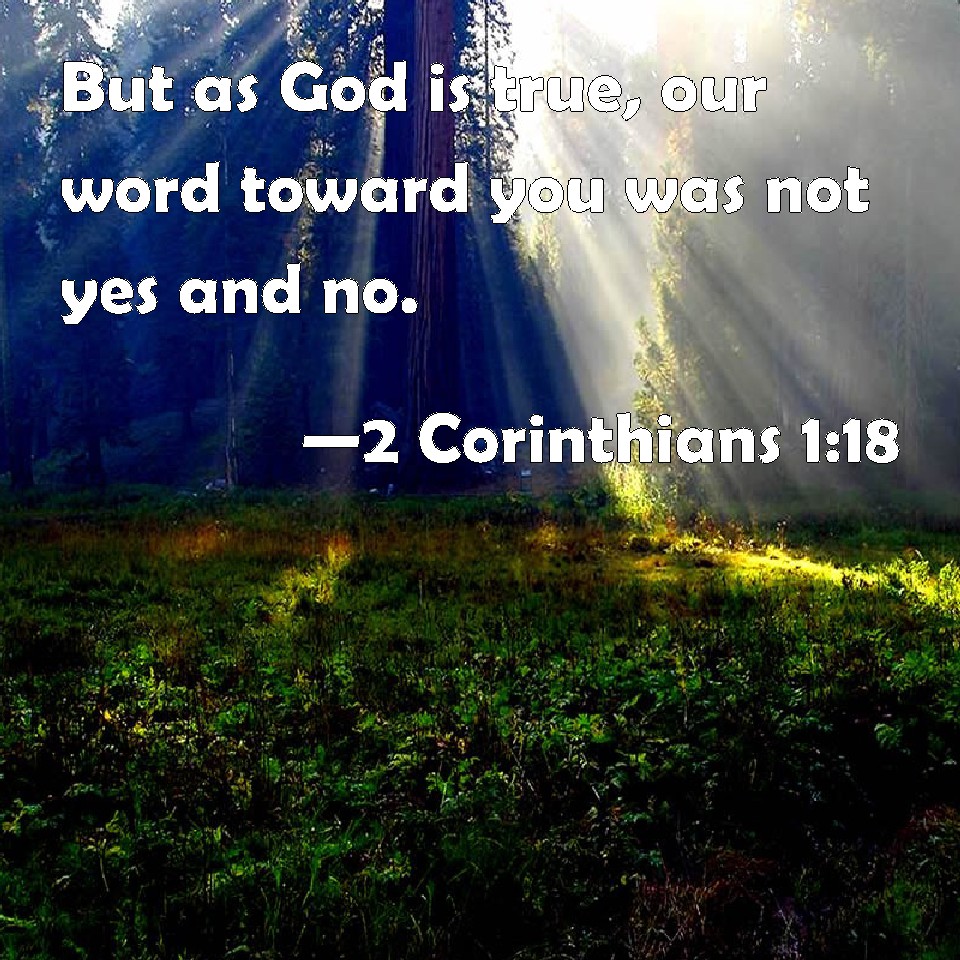 Choose a Background 2 Corinthians 1:18 But as God is true, our word toward you was not yes and no. KJV: But as God is true, our word toward you was not yea and nay. DRB: But God is faithful, for our preaching which was to you, was not, It is, and It is not. DBT: Now God is faithful, that our word to you is not yea and nay. ERV: But as God is faithful, our word toward you is not yea and nay. WBT: But as God is true, our word towards you was not yea and nay. WEB: But as God is faithful, our word toward you was not "Yes and no." YLT: and God is faithful, that our word unto you became not Yes and No,Links 2 Corinthians 1:18 NIV • 2 Corinthians 1:18 NLT • 2 Corinthians 1:18 ESV • 2 Corinthians 1:18 NASB • 2 Corinthians 1:18 KJV • 2 Corinthians 1:18 Interlinear • 2 Corinthians 1:18 Commentaries • 2 Corinthians 1:18 Parallel Texts • 2 Corinthians 1:18 Bible Apps • 2 Corinthians 1:18 Parallel • Bible Hub |