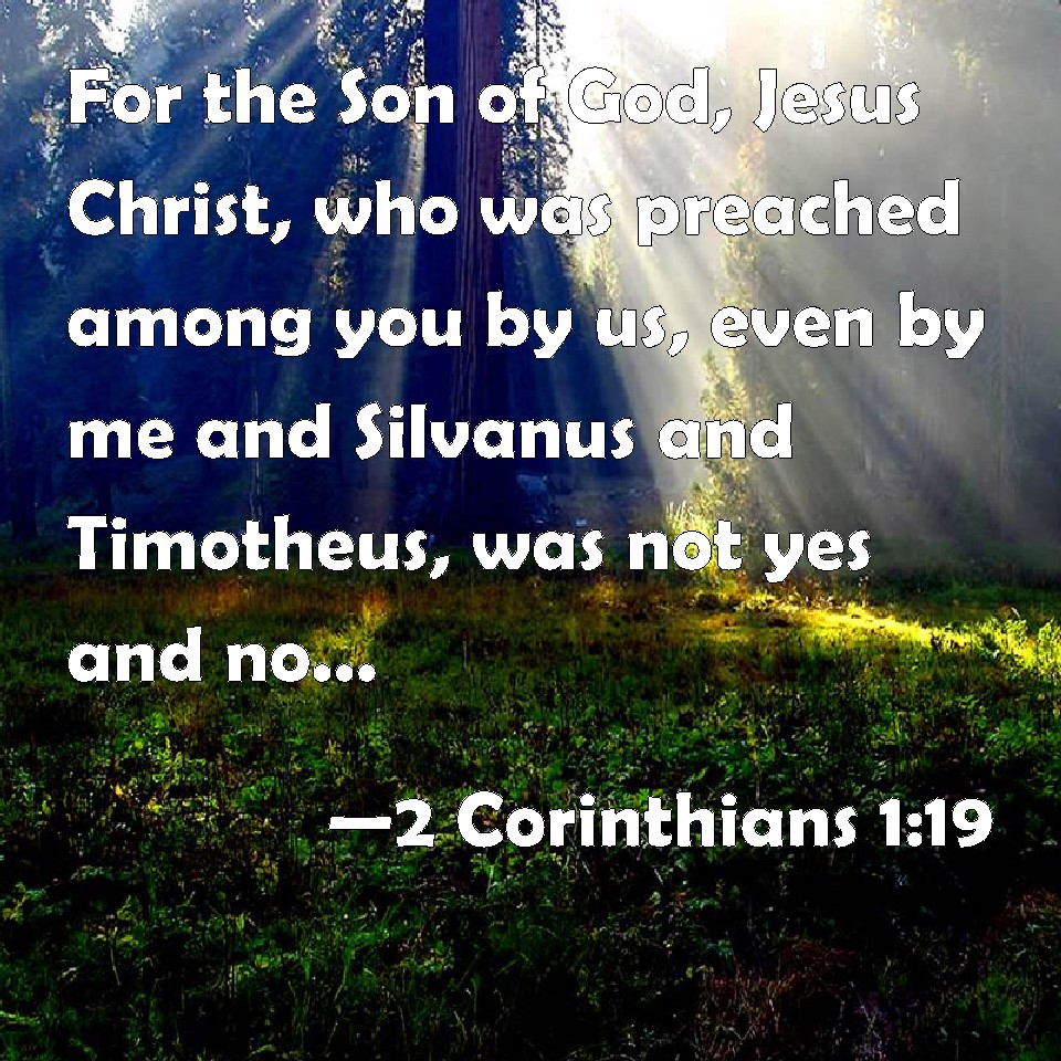Choose a Background 2 Corinthians 1:19 For the Son of God, Jesus Christ, who was preached among you by us, even by me and Silvanus and Timotheus, was not yes and no, but in him was yes. KJV: For the Son of God, Jesus Christ, who was preached among you by us, even by me and Silvanus and Timotheus, was not yea and nay, but in him was yea. DRB: For the Son of God, Jesus Christ who was preached among you by us, by me, and Sylvanus, and Timothy, was not, It is and It is not, but, It is, was in him. DBT: For the Son of God, Jesus Christ, he who has been preached by us among you (by me and Silvanus and Timotheus), did not become yea and nay, but yea is in him. ERV: For the Son of God, Jesus Christ, who was preached among you by us, even by me and Silvanus and Timothy, was not yea and nay, but in him is yea. WBT: For the Son of God, Jesus Christ, who was preached among you by us, even by me, and Silvanus, and Timothy, was not yea and nay, but in him was yea. WEB: For the Son of God, Jesus Christ, who was preached among you by us, by me, Silvanus, and Timothy, was not "Yes and no," but in him is "Yes." YLT: for the Son of God, Jesus Christ, among you through us having been preached — through me and Silvanus and Timotheus — did not become Yes and No, but in him it hath become Yes;Links 2 Corinthians 1:19 NIV • 2 Corinthians 1:19 NLT • 2 Corinthians 1:19 ESV • 2 Corinthians 1:19 NASB • 2 Corinthians 1:19 KJV • 2 Corinthians 1:19 Interlinear • 2 Corinthians 1:19 Commentaries • 2 Corinthians 1:19 Parallel Texts • 2 Corinthians 1:19 Bible Apps • 2 Corinthians 1:19 Parallel • Bible Hub |