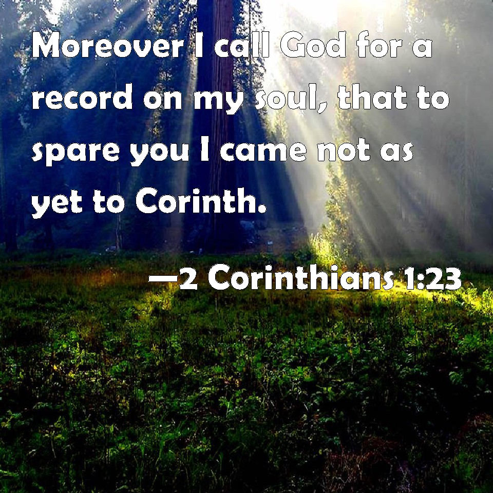 Choose a Background 2 Corinthians 1:23 Moreover I call God for a record on my soul, that to spare you I came not as yet to Corinth. KJV: Moreover I call God for a record upon my soul, that to spare you I came not as yet unto Corinth. DRB: But I call God to witness upon my soul, that to spare you, I came not any more to Corinth: DBT: But I call God to witness upon my soul that to spare you I have not yet come to Corinth. ERV: But I call God for a witness upon my soul, that to spare you I forbare to come unto Corinth. WBT: Moreover, I call God for a witness upon my soul, that to spare you I have not as yet come to Corinth. WEB: But I call God for a witness to my soul, that I didn't come to Corinth to spare you. YLT: And I for a witness on God do call upon my soul, that sparing you, I came not yet to Corinth;Links 2 Corinthians 1:23 NIV • 2 Corinthians 1:23 NLT • 2 Corinthians 1:23 ESV • 2 Corinthians 1:23 NASB • 2 Corinthians 1:23 KJV • 2 Corinthians 1:23 Interlinear • 2 Corinthians 1:23 Commentaries • 2 Corinthians 1:23 Parallel Texts • 2 Corinthians 1:23 Bible Apps • 2 Corinthians 1:23 Parallel • Bible Hub |
