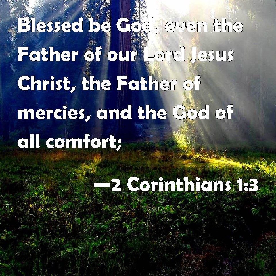 Choose a Background 2 Corinthians 1:3 Blessed be God, even the Father of our Lord Jesus Christ, the Father of mercies, and the God of all comfort; KJV: Blessed be God, even the Father of our Lord Jesus Christ, the Father of mercies, and the God of all comfort; DRB: Blessed be the God and Father of our Lord Jesus Christ, the Father of mercies, and the God of all comfort. DBT: Blessed be the God and Father of our Lord Jesus Christ, the Father of compassions, and God of all encouragement; ERV: Blessed be the God and Father of our Lord Jesus Christ, the Father of mercies and God of all comfort; WBT: Blessed be God, even the Father of our Lord Jesus Christ, the Father of mercies, and the God of all consolation. WEB: Blessed be the God and Father of our Lord Jesus Christ, the Father of mercies and God of all comfort; YLT: Blessed is God, even the Father of our Lord Jesus Christ, the Father of the mercies, and God of all comfort,Links 2 Corinthians 1:3 NIV • 2 Corinthians 1:3 NLT • 2 Corinthians 1:3 ESV • 2 Corinthians 1:3 NASB • 2 Corinthians 1:3 KJV • 2 Corinthians 1:3 Interlinear • 2 Corinthians 1:3 Commentaries • 2 Corinthians 1:3 Parallel Texts • 2 Corinthians 1:3 Bible Apps • 2 Corinthians 1:3 Parallel • Bible Hub |