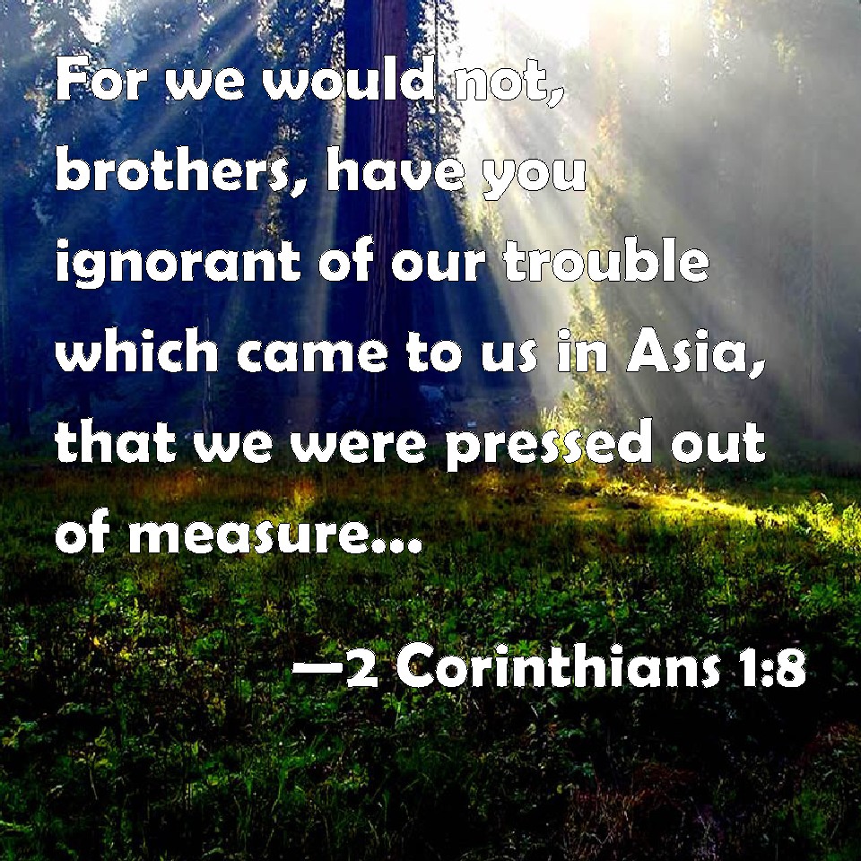 Choose a Background 2 Corinthians 1:8 For we would not, brothers, have you ignorant of our trouble which came to us in Asia, that we were pressed out of measure, above strength, so that we despaired even of life: KJV: For we would not, brethren, have you ignorant of our trouble which came to us in Asia, that we were pressed out of measure, above strength, insomuch that we despaired even of life: DRB: For we would not have you ignorant,brethren, of our tribulation, which came to us in Asia, that we were pressed out of measure above our strength, so that we were weary even of life. DBT: For we do not wish you to be ignorant, brethren, as to our tribulation which happened to us in Asia, that we were excessively pressed beyond our power, so as to despair even of living. ERV: For we would not have you ignorant, brethren, concerning our affliction which befell us in Asia, that we were weighed down exceedingly, beyond our power, insomuch that we despaired even of life: WBT: For we would not, brethren, have you ignorant of our trouble which came to us in Asia, that we were pressed out of measure, above strength, so that we despaired even of life: WEB: For we don't desire to have you uninformed, brothers, concerning our affliction which happened to us in Asia, that we were weighed down exceedingly, beyond our power, so much that we despaired even of life. YLT: For we do not wish you to be ignorant, brethren, of our tribulation that happened to us in Asia, that we were exceedingly burdened above our power, so that we despaired even of life;Links 2 Corinthians 1:8 NIV • 2 Corinthians 1:8 NLT • 2 Corinthians 1:8 ESV • 2 Corinthians 1:8 NASB • 2 Corinthians 1:8 KJV • 2 Corinthians 1:8 Interlinear • 2 Corinthians 1:8 Commentaries • 2 Corinthians 1:8 Parallel Texts • 2 Corinthians 1:8 Bible Apps • 2 Corinthians 1:8 Parallel • Bible Hub |