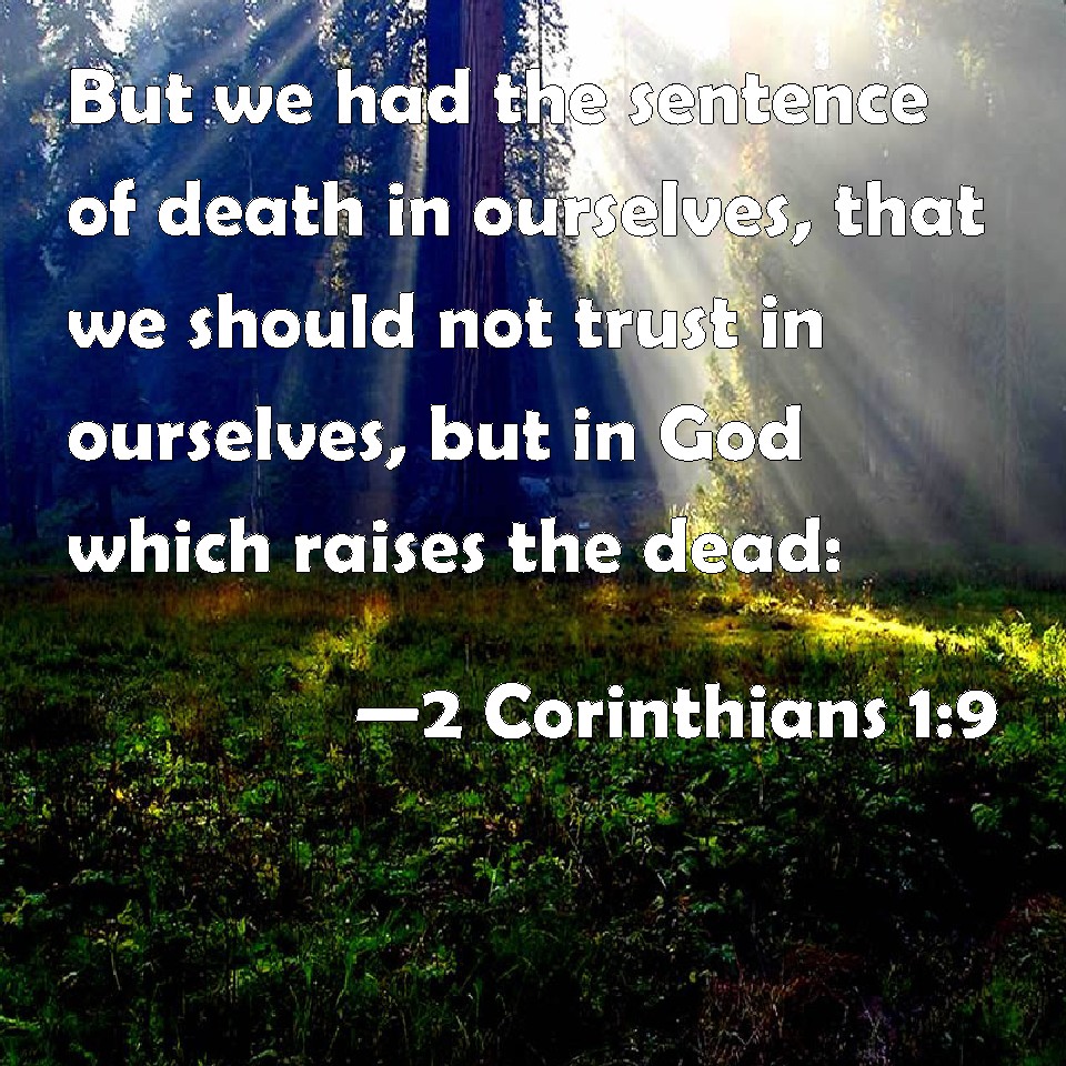 Choose a Background 2 Corinthians 1:9 But we had the sentence of death in ourselves, that we should not trust in ourselves, but in God which raises the dead: KJV: But we had the sentence of death in ourselves, that we should not trust in ourselves, but in God which raiseth the dead: DRB: But we had in ourselves the answer of death, that we should not trust in ourselves, but in God who raiseth the dead. DBT: But we ourselves had the sentence of death in ourselves, that we should not have our trust in ourselves, but in God who raises the dead; ERV: yea, we ourselves have had the answer of death within ourselves, that we should not trust in ourselves, but in God which raiseth the dead: WBT: But we had the sentence of death in ourselves, that we should not trust in ourselves, but in God who raiseth the dead: WEB: Yes, we ourselves have had the sentence of death within ourselves, that we should not trust in ourselves, but in God who raises the dead, YLT: but we ourselves in ourselves the sentence of the death have had, that we may not be trusting on ourselves, but on God, who is raising the dead,Links 2 Corinthians 1:9 NIV • 2 Corinthians 1:9 NLT • 2 Corinthians 1:9 ESV • 2 Corinthians 1:9 NASB • 2 Corinthians 1:9 KJV • 2 Corinthians 1:9 Interlinear • 2 Corinthians 1:9 Commentaries • 2 Corinthians 1:9 Parallel Texts • 2 Corinthians 1:9 Bible Apps • 2 Corinthians 1:9 Parallel • Bible Hub |