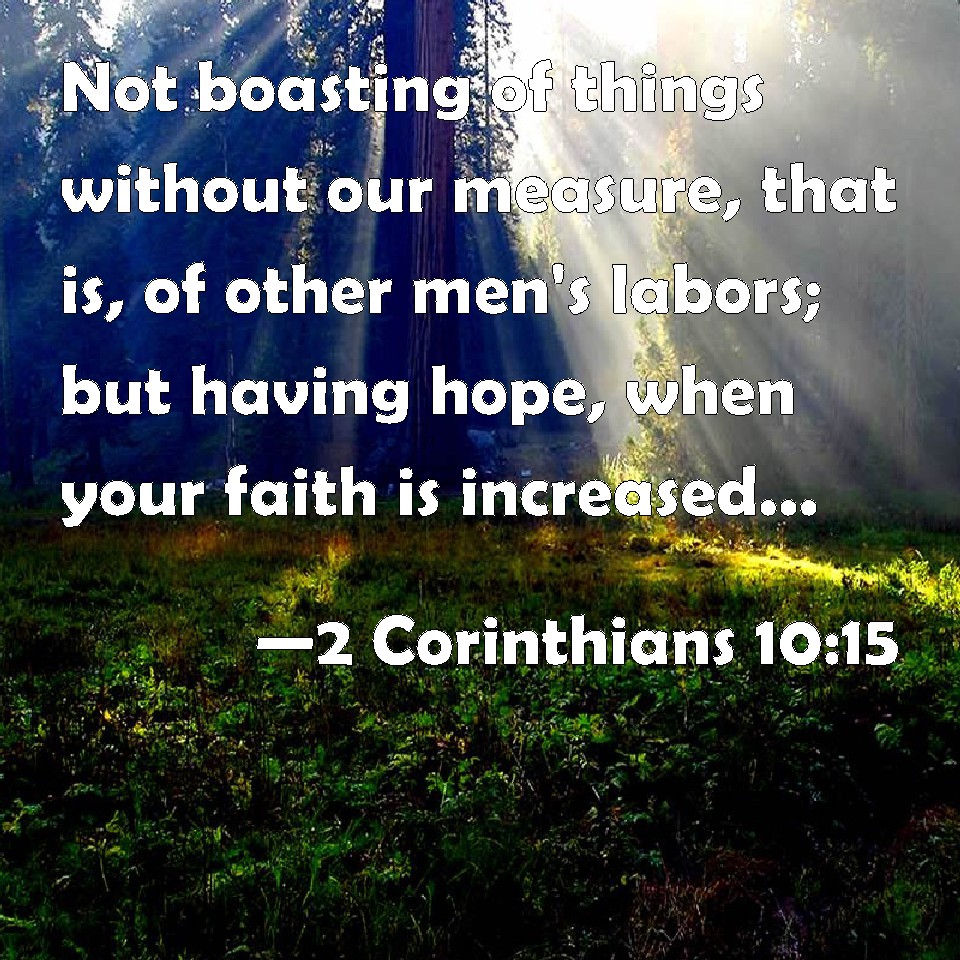 Choose a Background 2 Corinthians 10:15 Not boasting of things without our measure, that is, of other men's labors; but having hope, when your faith is increased, that we shall be enlarged by you according to our rule abundantly, KJV: Not boasting of things without our measure, that is, of other men's labours; but having hope, when your faith is increased, that we shall be enlarged by you according to our rule abundantly, DRB: Not glorying beyond measure in other men's labours; but having hope of your increasing faith, to be magnified in you according to our rule abundantly; DBT: not boasting out of measure in other people's labours, but having hope, your faith increasing, to be enlarged amongst you, according to our rule, yet more abundantly ERV: not glorying beyond our measure, that is, in other men's labours; but having hope that, as your faith groweth, we shall be magnified in you according to our province unto further abundance, WBT: Not boasting of things without our measure, that is, of other men's labors; but having hope, when your faith is increased, that we shall be enlarged by you, according to our rule abundantly, WEB: not boasting beyond proper limits in other men's labors, but having hope that as your faith grows, we will be abundantly enlarged by you in our sphere of influence, YLT: not boasting of the things not measured, in other men's labours, and having hope — your faith increasing — in you to be enlarged, according to our line — into abundance,Links 2 Corinthians 10:15 NIV • 2 Corinthians 10:15 NLT • 2 Corinthians 10:15 ESV • 2 Corinthians 10:15 NASB • 2 Corinthians 10:15 KJV • 2 Corinthians 10:15 Interlinear • 2 Corinthians 10:15 Commentaries • 2 Corinthians 10:15 Parallel Texts • 2 Corinthians 10:15 Bible Apps • 2 Corinthians 10:15 Parallel • Bible Hub |