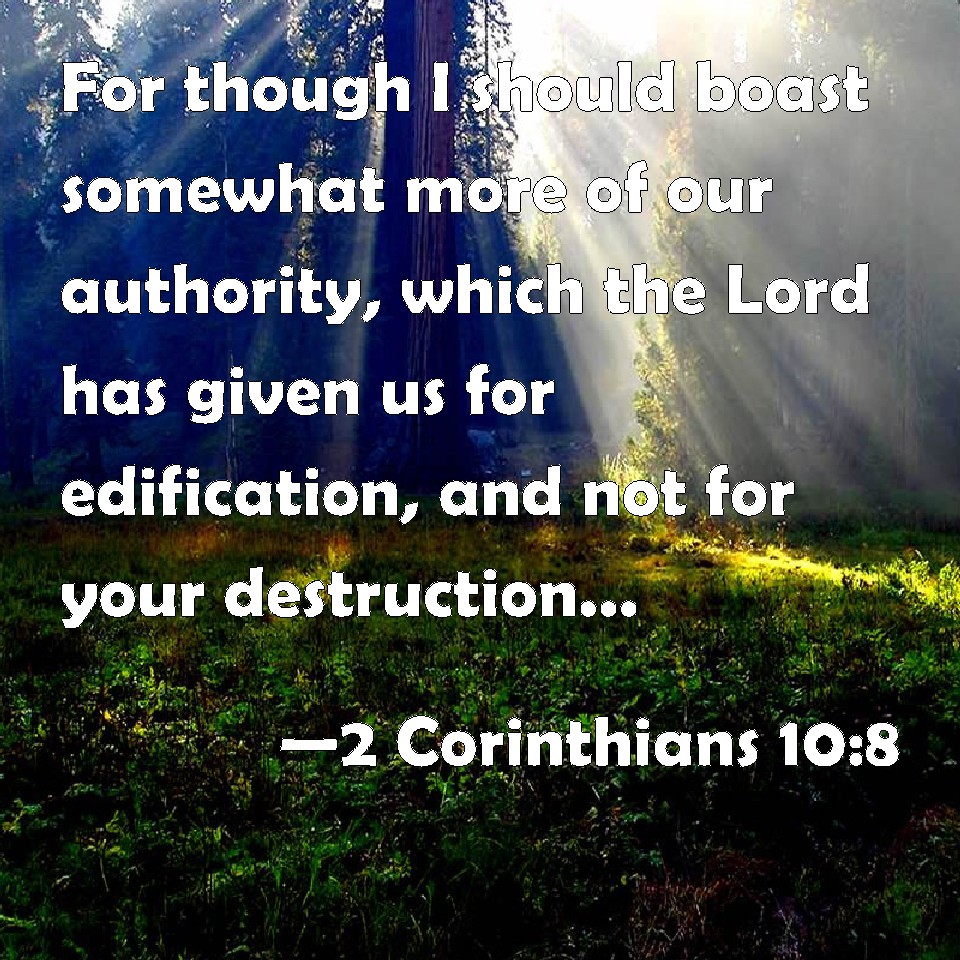 Choose a Background 2 Corinthians 10:8 For though I should boast somewhat more of our authority, which the Lord has given us for edification, and not for your destruction, I should not be ashamed: KJV: For though I should boast somewhat more of our authority, which the Lord hath given us for edification, and not for your destruction, I should not be ashamed: DRB: For if also I should boast somewhat more of our power, which the Lord hath given us unto edification, and not for your destruction, I should not be ashamed. DBT: For and if I should boast even somewhat more abundantly of our authority, which the Lord has given to us for building up and not for your overthrowing, I shall not be put to shame; ERV: For though I should glory somewhat abundantly concerning our authority (which the Lord gave for building you up, and not for casting you down), I shall not be put to shame: WBT: For though I should boast somewhat more of our authority, which the Lord hath given us for edification, and not for your destruction, I should not be ashamed: WEB: For though I should boast somewhat abundantly concerning our authority, (which the Lord gave for building you up, and not for casting you down) I will not be disappointed, YLT: for even if also anything more abundantly I shall boast concerning our authority, that the Lord gave us for building up, and not for casting you down, I shall not be ashamed;Links 2 Corinthians 10:8 NIV • 2 Corinthians 10:8 NLT • 2 Corinthians 10:8 ESV • 2 Corinthians 10:8 NASB • 2 Corinthians 10:8 KJV • 2 Corinthians 10:8 Interlinear • 2 Corinthians 10:8 Commentaries • 2 Corinthians 10:8 Parallel Texts • 2 Corinthians 10:8 Bible Apps • 2 Corinthians 10:8 Parallel • Bible Hub |