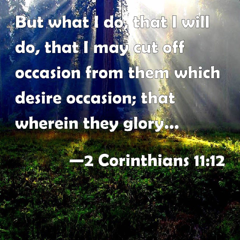 Choose a Background 2 Corinthians 11:12 But what I do, that I will do, that I may cut off occasion from them which desire occasion; that wherein they glory, they may be found even as we. KJV: But what I do, that I will do, that I may cut off occasion from them which desire occasion; that wherein they glory, they may be found even as we. DRB: But what I do, that I will do, that I may cut off the occasion from them that desire occasion, that wherein they glory, they may be found even as we. DBT: But what I do, I will also do, that I may cut off the opportunity of those wishing for an opportunity, that wherein they boast they may be found even as we. ERV: But what I do, that I will do, that I may cut off occasion from them which desire an occasion; that wherein they glory, they may be found even as we. WBT: But what I do, that I will do, that I may cut off occasion from them who desire occasion; that in what they glory, they may be found even as we. WEB: But what I do, that I will do, that I may cut off occasion from them that desire an occasion, that in which they boast, they may be found even as we. YLT: and what I do, I also will do, that I may cut off the occasion of those wishing an occasion, that in that which they boast they may be found according as we also;Links 2 Corinthians 11:12 NIV • 2 Corinthians 11:12 NLT • 2 Corinthians 11:12 ESV • 2 Corinthians 11:12 NASB • 2 Corinthians 11:12 KJV • 2 Corinthians 11:12 Interlinear • 2 Corinthians 11:12 Commentaries • 2 Corinthians 11:12 Parallel Texts • 2 Corinthians 11:12 Bible Apps • 2 Corinthians 11:12 Parallel • Bible Hub |