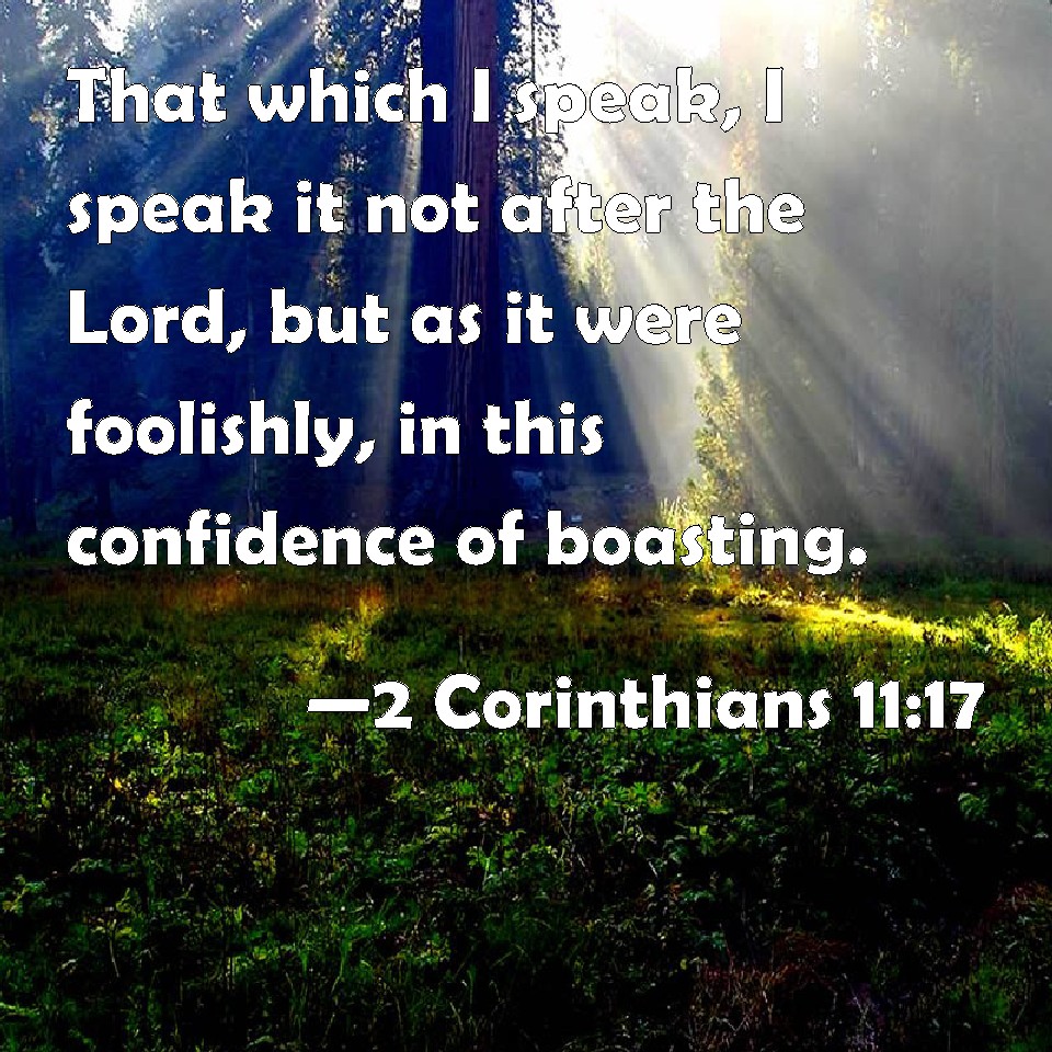 Choose a Background 2 Corinthians 11:17 That which I speak, I speak it not after the Lord, but as it were foolishly, in this confidence of boasting. KJV: That which I speak, I speak it not after the Lord, but as it were foolishly, in this confidence of boasting. DRB: That which I speak, I speak not according to God, but as it were in foolishness, in this matter of glorying. DBT: What I speak I do not speak according to the Lord, but as in folly, in this confidence of boasting. ERV: That which I speak, I speak not after the Lord, but as in foolishness, in this confidence of glorying. WBT: That which I speak, I speak it not according to the Lord, but as it were foolishly, in this confidence of boasting. WEB: That which I speak, I don't speak according to the Lord, but as in foolishness, in this confidence of boasting. YLT: That which I speak, I speak not according to the Lord, but as in foolishness, in this the confidence of boasting;Links 2 Corinthians 11:17 NIV • 2 Corinthians 11:17 NLT • 2 Corinthians 11:17 ESV • 2 Corinthians 11:17 NASB • 2 Corinthians 11:17 KJV • 2 Corinthians 11:17 Interlinear • 2 Corinthians 11:17 Commentaries • 2 Corinthians 11:17 Parallel Texts • 2 Corinthians 11:17 Bible Apps • 2 Corinthians 11:17 Parallel • Bible Hub |