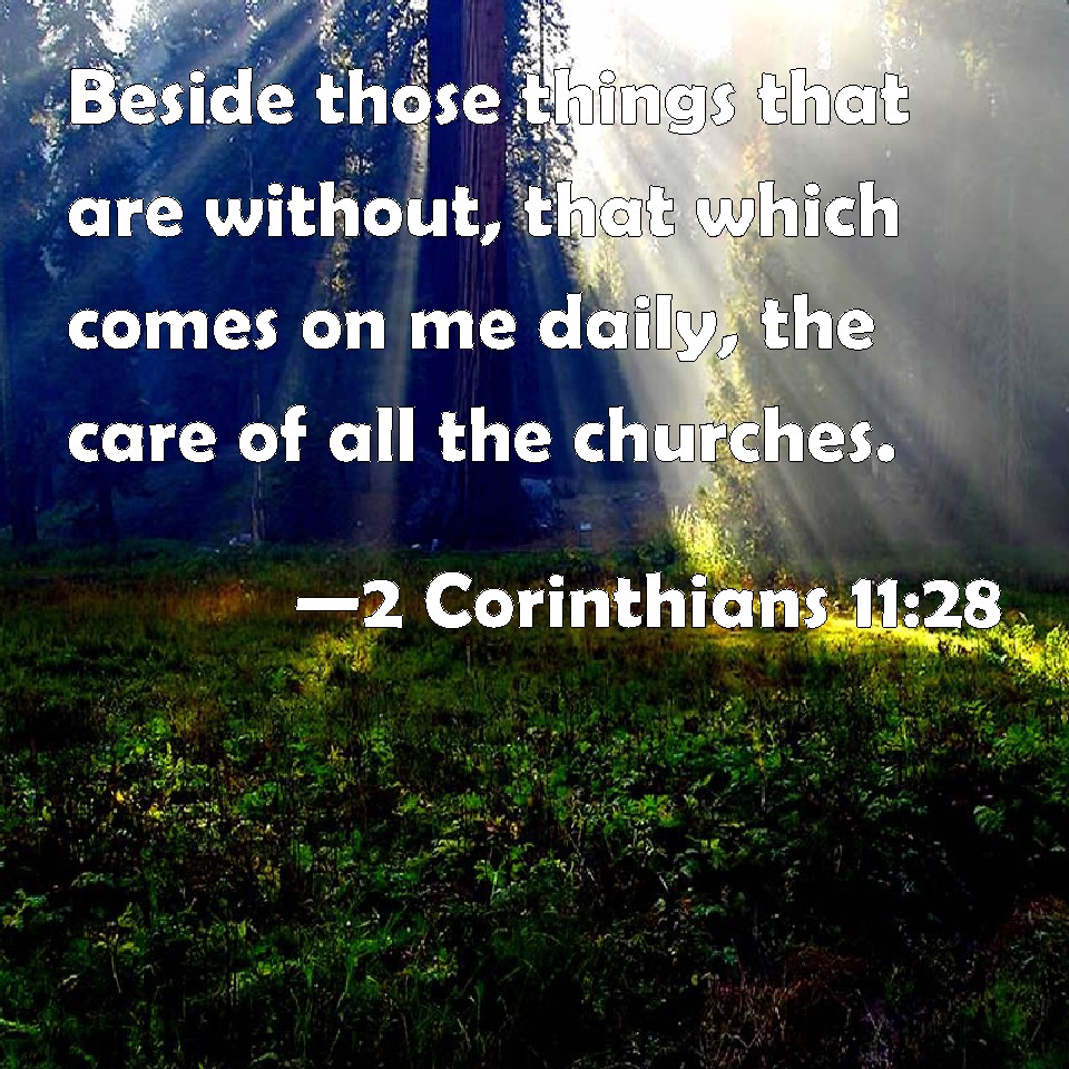 Choose a Background 2 Corinthians 11:28 Beside those things that are without, that which comes on me daily, the care of all the churches. KJV: Beside those things that are without, that which cometh upon me daily, the care of all the churches. DRB: Besides those things which are without: my daily instance, the solicitude for all the churches. DBT: Besides those things that are without, the crowd of cares pressing on me daily, the burden of all the assemblies. ERV: Beside those things that are without, there is that which presseth upon me daily, anxiety for all the churches. WBT: Besides those things that are without, that which cometh upon me daily, the care of all the churches. WEB: Besides those things that are outside, there is that which presses on me daily, anxiety for all the assemblies. YLT: apart from the things without — the crowding upon me that is daily — the care of all the assemblies.Links 2 Corinthians 11:28 NIV • 2 Corinthians 11:28 NLT • 2 Corinthians 11:28 ESV • 2 Corinthians 11:28 NASB • 2 Corinthians 11:28 KJV • 2 Corinthians 11:28 Interlinear • 2 Corinthians 11:28 Commentaries • 2 Corinthians 11:28 Parallel Texts • 2 Corinthians 11:28 Bible Apps • 2 Corinthians 11:28 Parallel • Bible Hub |