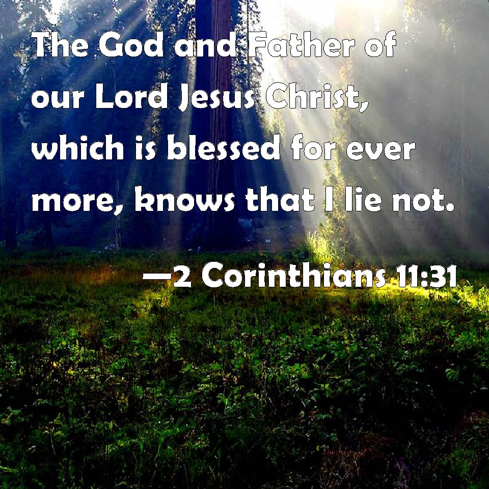 Choose a Background 2 Corinthians 11:31 The God and Father of our Lord Jesus Christ, which is blessed for ever more, knows that I lie not. KJV: The God and Father of our Lord Jesus Christ, which is blessed for evermore, knoweth that I lie not. DRB: The God and Father of our Lord Jesus Christ, who is blessed for ever, knoweth that I lie not. DBT: The God and Father of the Lord Jesus knows he who is blessed for ever that I do not lie. ERV: The God and Father of the Lord Jesus, he who is blessed for evermore, knoweth that I lie not. WBT: The God and Father of our Lord Jesus Christ, who is blessed for evermore, knoweth that I lie not. WEB: The God and Father of the Lord Jesus Christ, he who is blessed forevermore, knows that I don't lie. YLT: the God and Father of our Lord Jesus Christ — who is blessed to the ages — hath known that I do not lie! — Links 2 Corinthians 11:31 NIV • 2 Corinthians 11:31 NLT • 2 Corinthians 11:31 ESV • 2 Corinthians 11:31 NASB • 2 Corinthians 11:31 KJV • 2 Corinthians 11:31 Interlinear • 2 Corinthians 11:31 Commentaries • 2 Corinthians 11:31 Parallel Texts • 2 Corinthians 11:31 Bible Apps • 2 Corinthians 11:31 Parallel • Bible Hub |