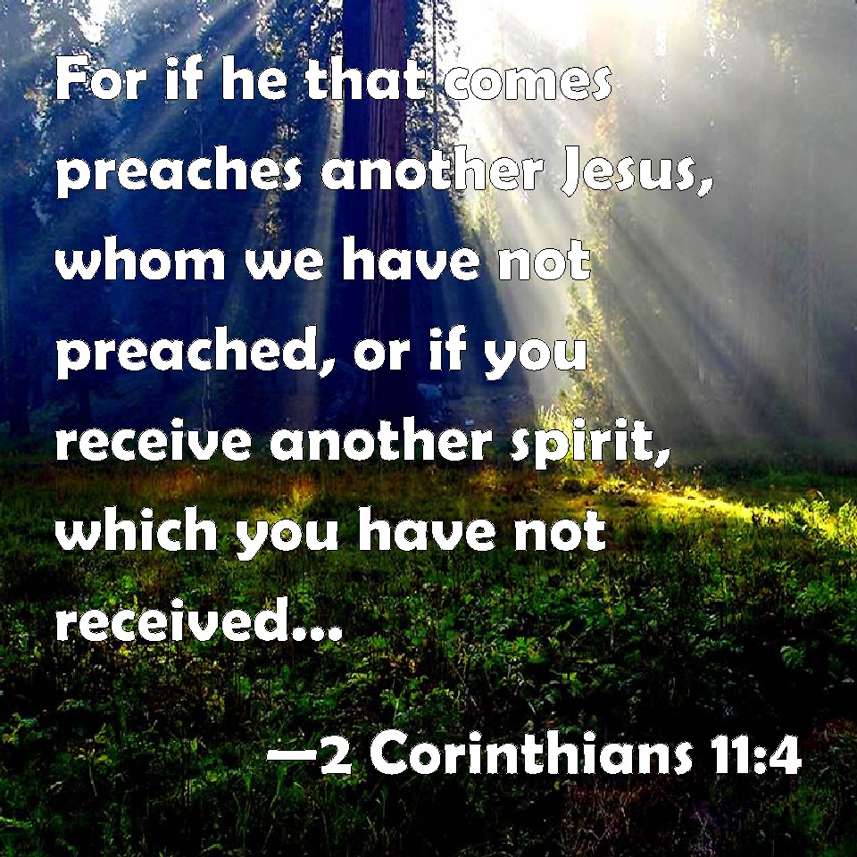 Choose a Background 2 Corinthians 11:4 For if he that comes preaches another Jesus, whom we have not preached, or if you receive another spirit, which you have not received, or another gospel, which you have not accepted, you might well bear with him. KJV: For if he that cometh preacheth another Jesus, whom we have not preached, or if ye receive another spirit, which ye have not received, or another gospel, which ye have not accepted, ye might well bear with him. DRB: For if he that cometh preacheth another Christ, whom we have not preached; or if you receive another Spirit, whom you have not received; or another gospel which you have not received; you might well bear with him. DBT: For if indeed he that comes preaches another Jesus, whom we have not preached, or ye get a different Spirit, which ye have not got, or a different glad tidings, which ye have not received, ye might well bear with it. ERV: For if he that cometh preacheth another Jesus, whom we did not preach, or if ye receive a different spirit, which ye did not receive, or a different gospel, which ye did not accept, ye do well to bear with him. WBT: For if he that cometh preacheth another Jesus, whom we have not preached, or if ye receive another spirit, which ye have not received, or another gospel, which ye have not accepted, ye might well bear with him. WEB: For if he who comes preaches another Jesus, whom we did not preach, or if you receive a different spirit, which you did not receive, or a different "good news", which you did not accept, you put up with that well enough. YLT: for if, indeed, he who is coming doth preach another Jesus whom we did not preach, or another Spirit ye receive which ye did not receive, or other good news which ye did not accept — well were ye bearing it,Links 2 Corinthians 11:4 NIV • 2 Corinthians 11:4 NLT • 2 Corinthians 11:4 ESV • 2 Corinthians 11:4 NASB • 2 Corinthians 11:4 KJV • 2 Corinthians 11:4 Interlinear • 2 Corinthians 11:4 Commentaries • 2 Corinthians 11:4 Parallel Texts • 2 Corinthians 11:4 Bible Apps • 2 Corinthians 11:4 Parallel • Bible Hub |