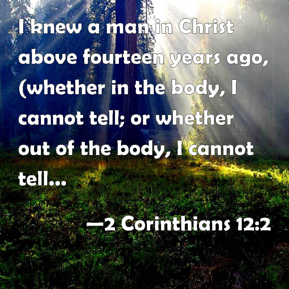 Choose a Background 2 Corinthians 12:2 I knew a man in Christ above fourteen years ago, (whether in the body, I cannot tell; or whether out of the body, I cannot tell: God knows;) such an one caught up to the third heaven. KJV: I knew a man in Christ above fourteen years ago, (whether in the body, I cannot tell; or whether out of the body, I cannot tell: God knoweth;) such an one caught up to the third heaven. DRB: I know a man in Christ above fourteen years ago (whether in the body, I know not, or out of the body, I know not; God knoweth), such a one caught up to the third heaven. DBT: I know a man in Christ, fourteen years ago, (whether in the body I know not, or out of the body I know not, God knows;) such a one caught up to the third heaven. ERV: I know a man in Christ, fourteen years ago (whether in the body, I know not; or whether out of the body, I know not; God knoweth), such a one caught up even to the third heaven. WBT: I knew a man in Christ above fourteen years ago, (whether in the body, I cannot tell; or whether out of the body, I cannot tell: God knoweth;) such one caught up to the third heaven. WEB: I know a man in Christ, fourteen years ago (whether in the body, I don't know, or whether out of the body, I don't know; God knows), such a one caught up into the third heaven. YLT: I have known a man in Christ, fourteen years ago — whether in the body I have not known, whether out of the body I have not known, God hath known — such an one being caught away unto the third heaven;Links 2 Corinthians 12:2 NIV • 2 Corinthians 12:2 NLT • 2 Corinthians 12:2 ESV • 2 Corinthians 12:2 NASB • 2 Corinthians 12:2 KJV • 2 Corinthians 12:2 Interlinear • 2 Corinthians 12:2 Commentaries • 2 Corinthians 12:2 Parallel Texts • 2 Corinthians 12:2 Bible Apps • 2 Corinthians 12:2 Parallel • Bible Hub |