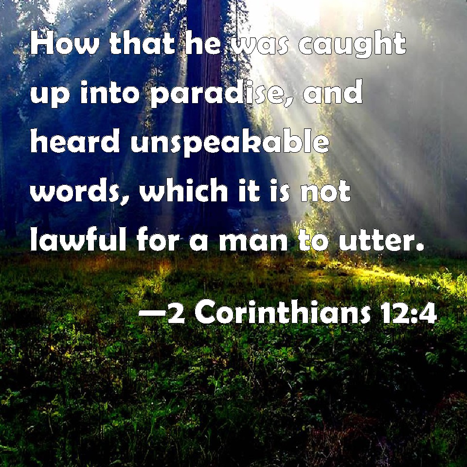 Choose a Background 2 Corinthians 12:4 How that he was caught up into paradise, and heard unspeakable words, which it is not lawful for a man to utter. KJV: How that he was caught up into paradise, and heard unspeakable words, which it is not lawful for a man to utter. DRB: That he was caught up into paradise, and heard secret words, which it is not granted to man to utter. DBT: that he was caught up into paradise, and heard unspeakable things said which it is not allowed to man to utter. ERV: how that he was caught up into Paradise, and heard unspeakable words, which it is not lawful for a man to utter. WBT: That he was caught up into paradise, and heard unspeakable words, which it is not lawful for a man to utter. WEB: how he was caught up into Paradise, and heard unspeakable words, which it is not lawful for a man to utter. YLT: that he was caught away to the paradise, and heard unutterable sayings, that it is not possible for man to speak.Links 2 Corinthians 12:4 NIV • 2 Corinthians 12:4 NLT • 2 Corinthians 12:4 ESV • 2 Corinthians 12:4 NASB • 2 Corinthians 12:4 KJV • 2 Corinthians 12:4 Interlinear • 2 Corinthians 12:4 Commentaries • 2 Corinthians 12:4 Parallel Texts • 2 Corinthians 12:4 Bible Apps • 2 Corinthians 12:4 Parallel • Bible Hub |
