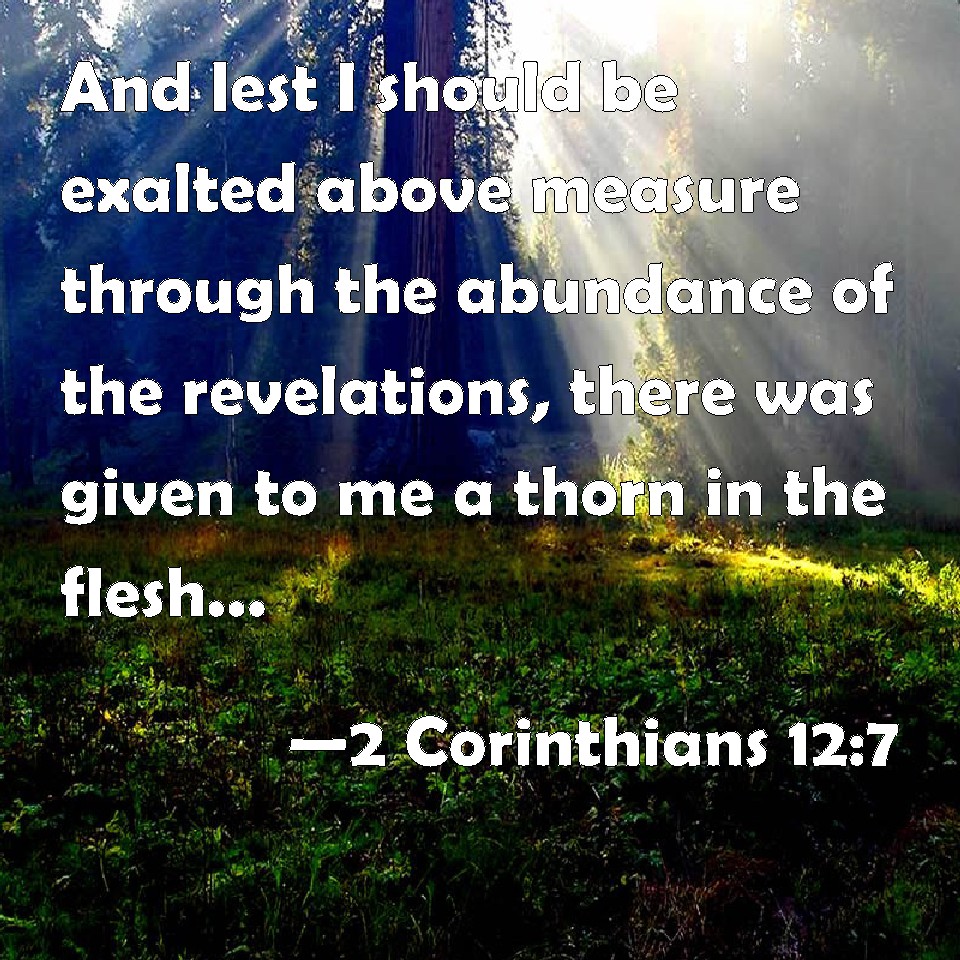 Choose a Background 2 Corinthians 12:7 And lest I should be exalted above measure through the abundance of the revelations, there was given to me a thorn in the flesh, the messenger of Satan to buffet me, lest I should be exalted above measure. KJV: And lest I should be exalted above measure through the abundance of the revelations, there was given to me a thorn in the flesh, the messenger of Satan to buffet me, lest I should be exalted above measure. DRB: And lest the greatness of the revelations should exalt me, there was given me a sting of my flesh, an angel of Satan, to buffet me. DBT: And that I might not be exalted by the exceeding greatness of the revelations, there was given to me a thorn for the flesh, a messenger of Satan that he might buffet me, that I might not be exalted. ERV: And by reason of the exceeding greatness of the revelations—wherefore, that I should not be exalted overmuch, there was given to me a thorn in the flesh, a messenger of Satan to buffet me, that I should not be exalted overmuch. WBT: And lest I should be exalted above measure through the abundance of the revelations, there was given to me a thorn in the flesh, the messenger of Satan to buffet me, lest I should be exalted above measure. WEB: By reason of the exceeding greatness of the revelations, that I should not be exalted excessively, there was given to me a thorn in the flesh, a messenger of Satan to torment me, that I should not be exalted excessively. YLT: and that by the exceeding greatness of the revelations I might not be exalted overmuch, there was given to me a thorn in the flesh, a messenger of the Adversary, that he might buffet me, that I might not be exalted overmuch.Links 2 Corinthians 12:7 NIV • 2 Corinthians 12:7 NLT • 2 Corinthians 12:7 ESV • 2 Corinthians 12:7 NASB • 2 Corinthians 12:7 KJV • 2 Corinthians 12:7 Interlinear • 2 Corinthians 12:7 Commentaries • 2 Corinthians 12:7 Parallel Texts • 2 Corinthians 12:7 Bible Apps • 2 Corinthians 12:7 Parallel • Bible Hub |