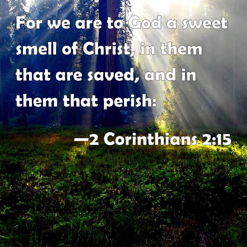Choose a Background 2 Corinthians 2:15 For we are to God a sweet smell of Christ, in them that are saved, and in them that perish: KJV: For we are unto God a sweet savour of Christ, in them that are saved, and in them that perish: DRB: For we are the good odour of Christ unto God, in them that are saved, and in them that perish. DBT: For we are a sweet odour of Christ to God, in the saved and in those that perish: ERV: For we are a sweet savour of Christ unto God, in them that are being saved, and in them that are perishing; WBT: For we are to God a sweet savor of Christ, in them that are saved, and in them that perish: WEB: For we are a sweet aroma of Christ to God, in those who are saved, and in those who perish; YLT: because of Christ a sweet fragrance we are to God, in those being saved, and in those being lost;Links 2 Corinthians 2:15 NIV • 2 Corinthians 2:15 NLT • 2 Corinthians 2:15 ESV • 2 Corinthians 2:15 NASB • 2 Corinthians 2:15 KJV • 2 Corinthians 2:15 Interlinear • 2 Corinthians 2:15 Commentaries • 2 Corinthians 2:15 Parallel Texts • 2 Corinthians 2:15 Bible Apps • 2 Corinthians 2:15 Parallel • Bible Hub |