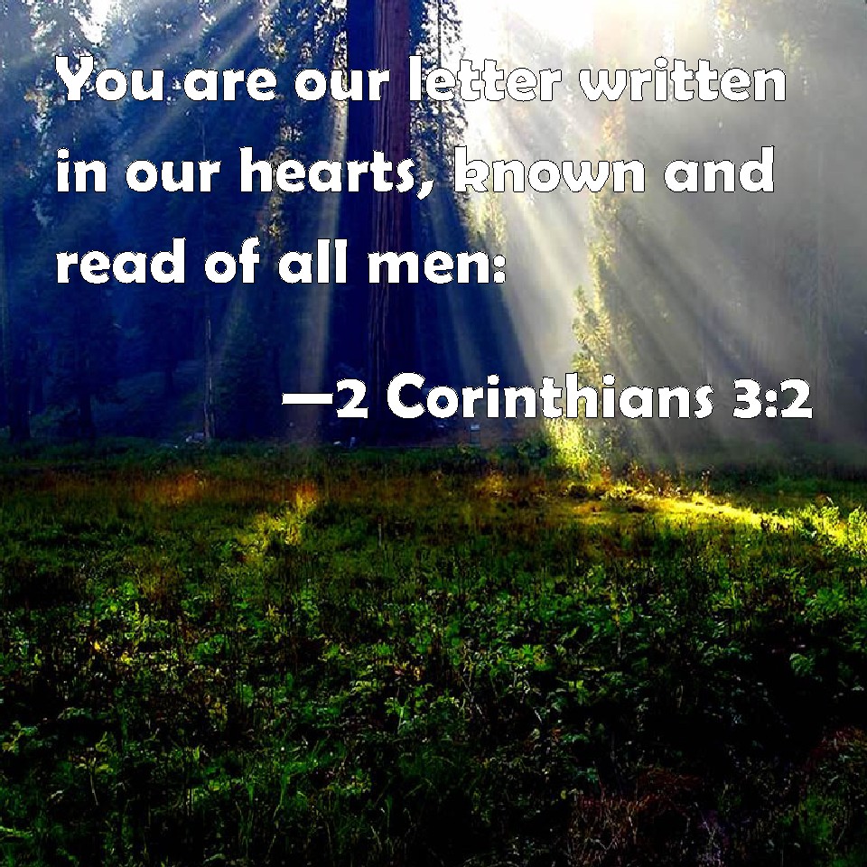 Choose a Background 2 Corinthians 3:2 You are our letter written in our hearts, known and read of all men: KJV: Ye are our epistle written in our hearts, known and read of all men: DRB: You are our epistle, written in our hearts, which is known and read by all men: DBT: Ye are our letter, written in our hearts, known and read of all men, ERV: Ye are our epistle, written in our hearts, known and read of all men; WBT: Ye are our epistle written in our hearts, known and read by all men: WEB: You are our letter, written in our hearts, known and read by all men; YLT: our letter ye are, having been written in our hearts, known and read by all men,Links 2 Corinthians 3:2 NIV • 2 Corinthians 3:2 NLT • 2 Corinthians 3:2 ESV • 2 Corinthians 3:2 NASB • 2 Corinthians 3:2 KJV • 2 Corinthians 3:2 Interlinear • 2 Corinthians 3:2 Commentaries • 2 Corinthians 3:2 Parallel Texts • 2 Corinthians 3:2 Bible Apps • 2 Corinthians 3:2 Parallel • Bible Hub |