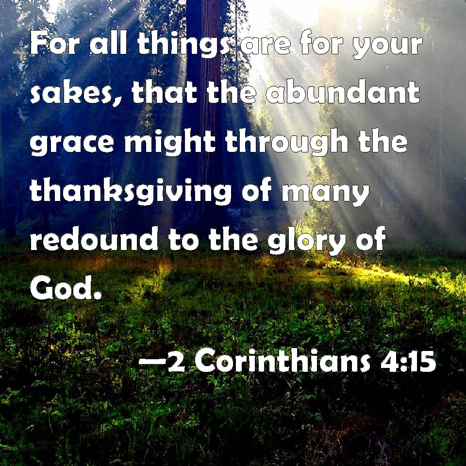 Choose a Background 2 Corinthians 4:15 For all things are for your sakes, that the abundant grace might through the thanksgiving of many redound to the glory of God. KJV: For all things are for your sakes, that the abundant grace might through the thanksgiving of many redound to the glory of God. DRB: For all things are for your sakes; that the grace abounding through many, may abound in thanksgiving unto the glory of God. DBT: For all things are for your sakes, that the grace abounding through the many may cause thanksgiving to abound to the glory of God. ERV: For all things are for your sakes, that the grace, being multiplied through the many, may cause the thanksgiving to abound unto the glory of God. WBT: For all things are for your sakes, that the abundant grace may, through the thanksgiving of many, redound to the glory of God. WEB: For all things are for your sakes, that the grace, being multiplied through the many, may cause the thanksgiving to abound to the glory of God. YLT: for the all things are because of you, that the grace having been multiplied, because of the thanksgiving of the more, may abound to the glory of God;Links 2 Corinthians 4:15 NIV • 2 Corinthians 4:15 NLT • 2 Corinthians 4:15 ESV • 2 Corinthians 4:15 NASB • 2 Corinthians 4:15 KJV • 2 Corinthians 4:15 Interlinear • 2 Corinthians 4:15 Commentaries • 2 Corinthians 4:15 Parallel Texts • 2 Corinthians 4:15 Bible Apps • 2 Corinthians 4:15 Parallel • Bible Hub |