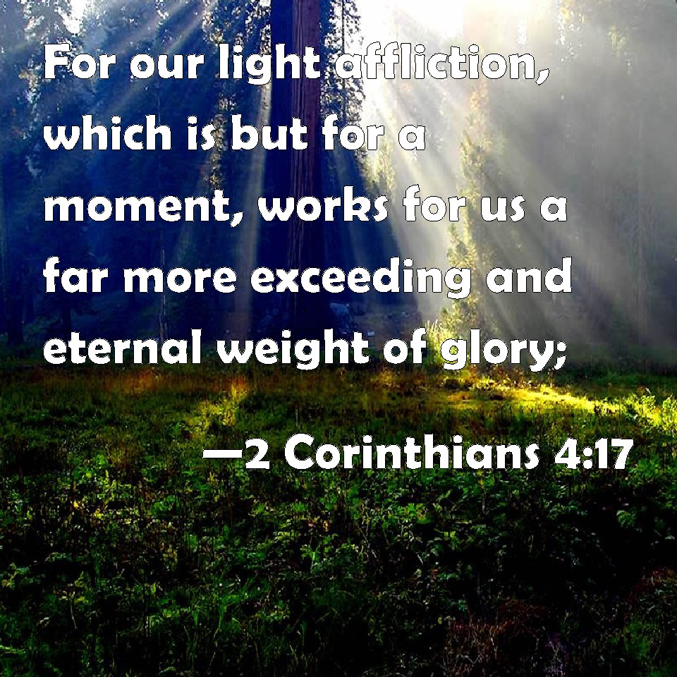 Choose a Background 2 Corinthians 4:17 For our light affliction, which is but for a moment, works for us a far more exceeding and eternal weight of glory; KJV: For our light affliction, which is but for a moment, worketh for us a far more exceeding and eternal weight of glory; DRB: For that which is at present momentary and light of our tribulation, worketh for us above measure exceedingly an eternal weight of glory. DBT: For our momentary and light affliction works for us in surpassing measure an eternal weight of glory; ERV: For our light affliction, which is for the moment, worketh for us more and more exceedingly an eternal weight of glory; WBT: For our light affliction, which is but for a moment, worketh out for us a far more exceeding and eternal weight of glory; WEB: For our light affliction, which is for the moment, works for us more and more exceedingly an eternal weight of glory; YLT: for the momentary light matter of our tribulation, more and more exceedingly an age-during weight of glory doth work out for us — Links 2 Corinthians 4:17 NIV • 2 Corinthians 4:17 NLT • 2 Corinthians 4:17 ESV • 2 Corinthians 4:17 NASB • 2 Corinthians 4:17 KJV • 2 Corinthians 4:17 Interlinear • 2 Corinthians 4:17 Commentaries • 2 Corinthians 4:17 Parallel Texts • 2 Corinthians 4:17 Bible Apps • 2 Corinthians 4:17 Parallel • Bible Hub |