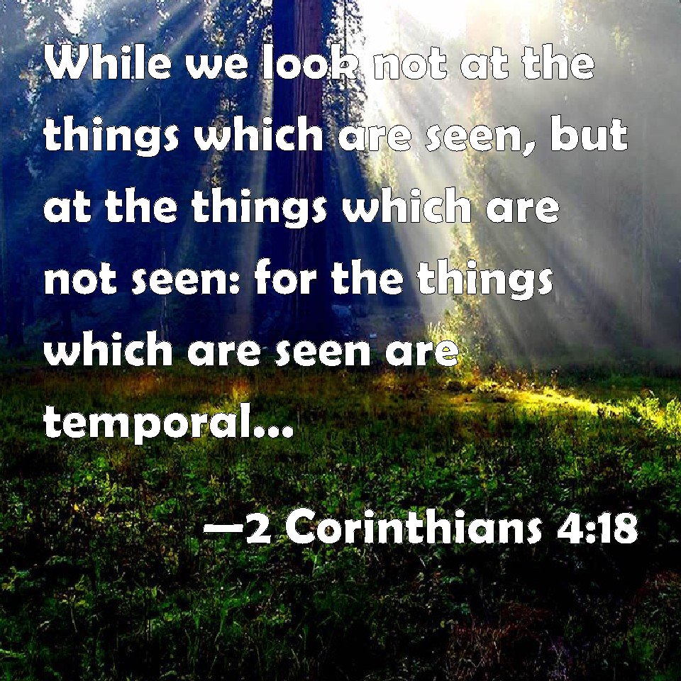 Choose a Background 2 Corinthians 4:18 While we look not at the things which are seen, but at the things which are not seen: for the things which are seen are temporal; but the things which are not seen are eternal. KJV: While we look not at the things which are seen, but at the things which are not seen: for the things which are seen are temporal; but the things which are not seen are eternal. DRB: While we look not at the things which are seen, but at the things which are not seen. For the things which are seen, are temporal; but the things which are not seen, are eternal. DBT: while we look not at the things that are seen, but at the things that are not seen; for the things that are seen are for a time, but those that are not seen eternal. ERV: while we look not at the things which are seen, but at the things which are not seen: for the things which are seen are temporal; but the things which are not seen are eternal. WBT: While we look not at the things which are seen, but at the things which are not seen: for the things which are seen are temporal; but the things which are not seen are eternal. WEB: while we don't look at the things which are seen, but at the things which are not seen. For the things which are seen are temporal, but the things which are not seen are eternal. YLT: we not looking to the things seen, but to the things not seen; for the things seen are temporary, but the things not seen are age-during.Links 2 Corinthians 4:18 NIV • 2 Corinthians 4:18 NLT • 2 Corinthians 4:18 ESV • 2 Corinthians 4:18 NASB • 2 Corinthians 4:18 KJV • 2 Corinthians 4:18 Interlinear • 2 Corinthians 4:18 Commentaries • 2 Corinthians 4:18 Parallel Texts • 2 Corinthians 4:18 Bible Apps • 2 Corinthians 4:18 Parallel • Bible Hub |