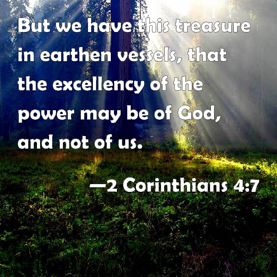 Choose a Background 2 Corinthians 4:7 But we have this treasure in earthen vessels, that the excellency of the power may be of God, and not of us. KJV: But we have this treasure in earthen vessels, that the excellency of the power may be of God, and not of us. DRB: But we have this treasure in earthen vessels, that the excellency may be of the power of God, and not of us. DBT: But we have this treasure in earthen vessels, that the surpassingness of the power may be of God, and not from us: ERV: But we have this treasure in earthen vessels, that the exceeding greatness of the power may be of God, and not from ourselves; WBT: But we have this treasure in earthen vessels, that the excellence of the power may be of God, and not from us. WEB: But we have this treasure in clay vessels, that the exceeding greatness of the power may be of God, and not from ourselves. YLT: And we have this treasure in earthen vessels, that the excellency of the power may be of God, and not of us;Links 2 Corinthians 4:7 NIV • 2 Corinthians 4:7 NLT • 2 Corinthians 4:7 ESV • 2 Corinthians 4:7 NASB • 2 Corinthians 4:7 KJV • 2 Corinthians 4:7 Interlinear • 2 Corinthians 4:7 Commentaries • 2 Corinthians 4:7 Parallel Texts • 2 Corinthians 4:7 Bible Apps • 2 Corinthians 4:7 Parallel • Bible Hub |
