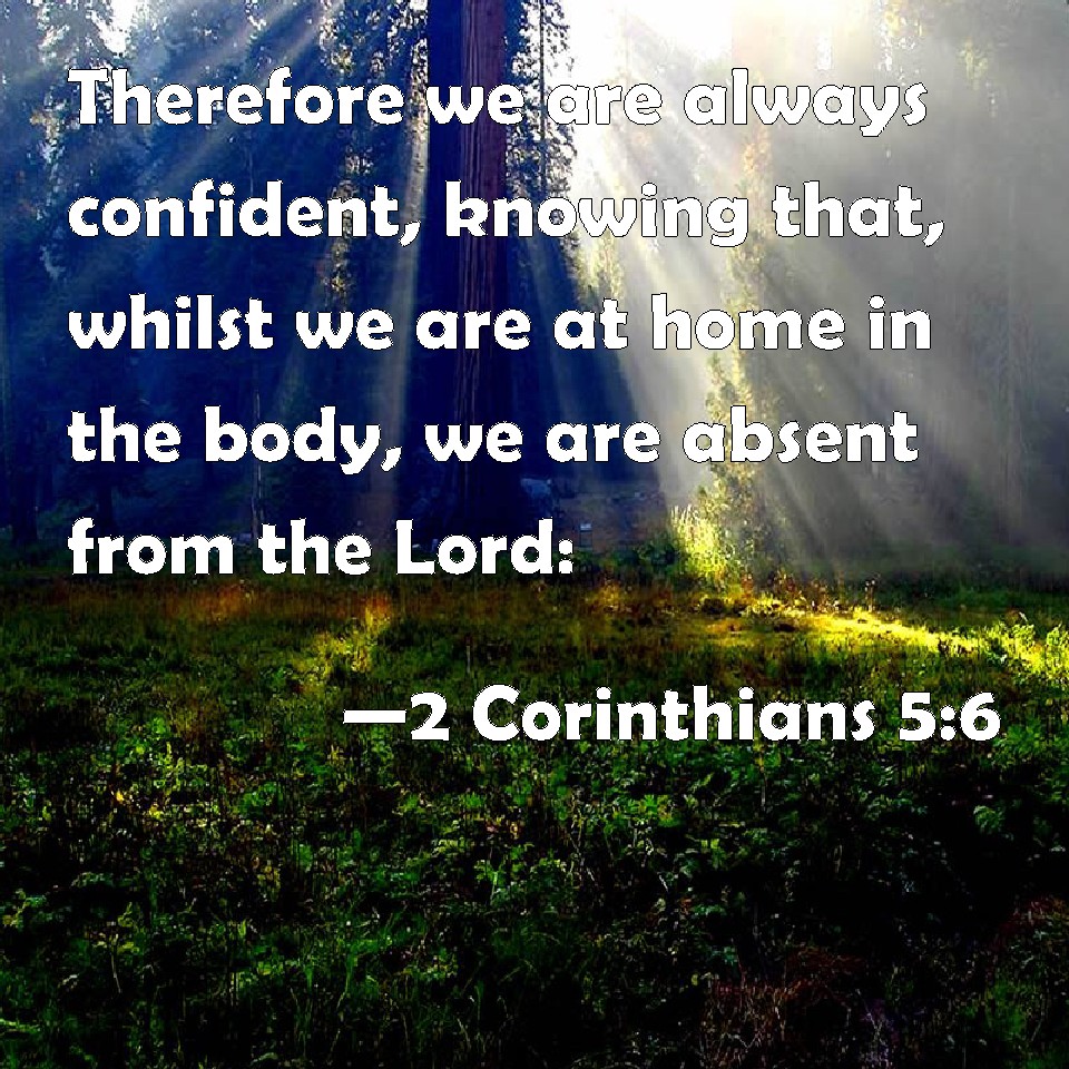 Choose a Background 2 Corinthians 5:6 Therefore we are always confident, knowing that, whilst we are at home in the body, we are absent from the Lord: KJV: Therefore we are always confident, knowing that, whilst we are at home in the body, we are absent from the Lord: DRB: Therefore having always confidence, knowing that, while we are in the body, we are absent from the Lord. DBT: Therefore we are always confident, and know that while present in the body we are absent from the Lord, ERV: Being therefore always of good courage, and knowing that, whilst we are at home in the body, we are absent from the Lord WBT: Therefore we are always confident, knowing that, while we are at home in the body, we are absent from the Lord: WEB: Therefore, we are always confident and know that while we are at home in the body, we are absent from the Lord; YLT: having courage, then, at all times, and knowing that being at home in the body, we are away from home from the Lord, — Links 2 Corinthians 5:6 NIV • 2 Corinthians 5:6 NLT • 2 Corinthians 5:6 ESV • 2 Corinthians 5:6 NASB • 2 Corinthians 5:6 KJV • 2 Corinthians 5:6 Interlinear • 2 Corinthians 5:6 Commentaries • 2 Corinthians 5:6 Parallel Texts • 2 Corinthians 5:6 Bible Apps • 2 Corinthians 5:6 Parallel • Bible Hub |