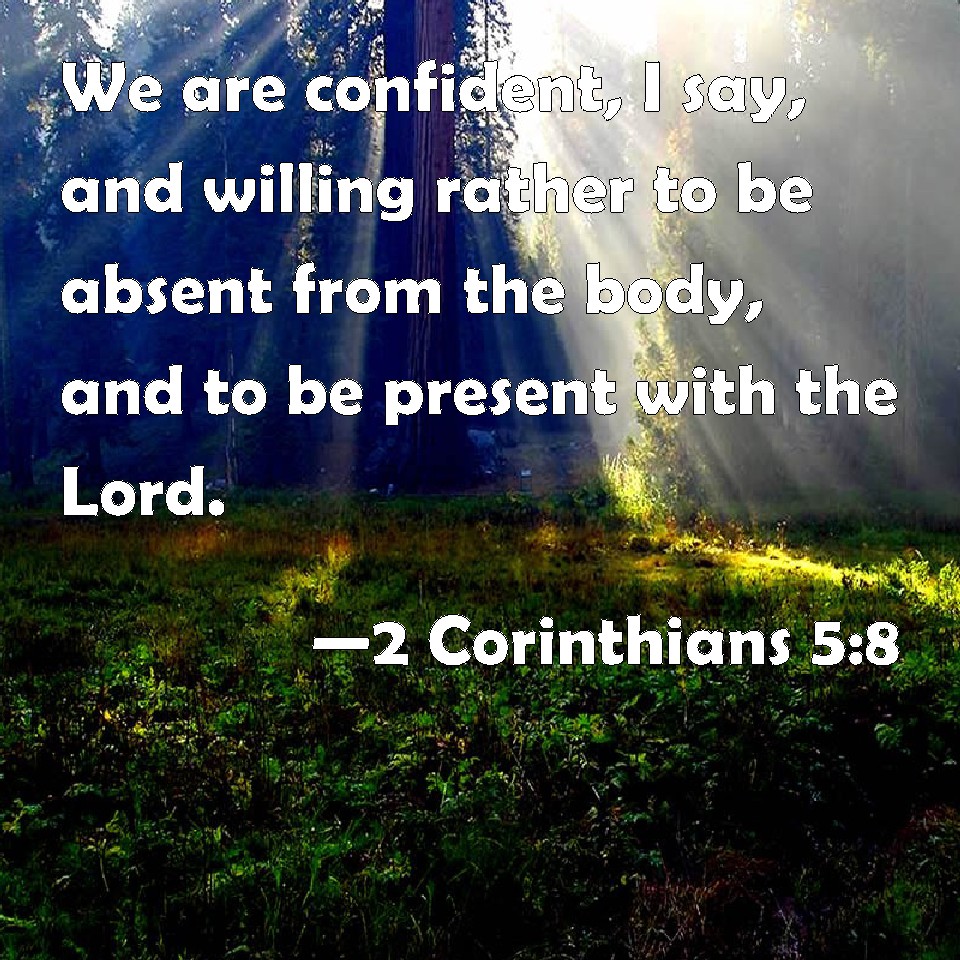 Choose a Background 2 Corinthians 5:8 We are confident, I say, and willing rather to be absent from the body, and to be present with the Lord. KJV: We are confident, I say, and willing rather to be absent from the body, and to be present with the Lord. DRB: But we are confident, and have a good will to be absent rather from the body, and to be present with the Lord. DBT: we are confident, I say, and pleased rather to be absent from the body and present with the Lord. ERV: we are of good courage, I say, and are willing rather to be absent from the body, and to be at home with the Lord. WBT: We are confident, I say, and willing rather to be absent from the body, and to be present with the Lord. WEB: We are courageous, I say, and are willing rather to be absent from the body, and to be at home with the Lord. YLT: we have courage, and are well pleased rather to be away from the home of the body, and to be at home with the Lord.Links 2 Corinthians 5:8 NIV • 2 Corinthians 5:8 NLT • 2 Corinthians 5:8 ESV • 2 Corinthians 5:8 NASB • 2 Corinthians 5:8 KJV • 2 Corinthians 5:8 Interlinear • 2 Corinthians 5:8 Commentaries • 2 Corinthians 5:8 Parallel Texts • 2 Corinthians 5:8 Bible Apps • 2 Corinthians 5:8 Parallel • Bible Hub |