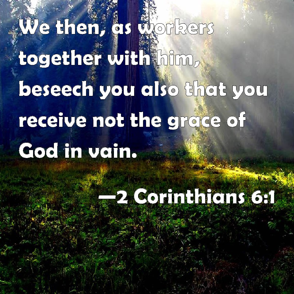 Choose a Background 2 Corinthians 6:1 We then, as workers together with him, beseech you also that you receive not the grace of God in vain. KJV: We then, as workers together with him, beseech you also that ye receive not the grace of God in vain. DRB: And we helping do exhort you, that you receive not the grace of God in vain. DBT: But as fellow-workmen, we also beseech that ye receive not the grace of God in vain: ERV: And working together with him we entreat also that ye receive not the grace of God in vain WBT: We then, as co-workers with him, beseech you also that ye receive not the grace of God in vain. WEB: Working together, we entreat also that you not receive the grace of God in vain, YLT: And working together also we call upon you that ye receive not in vain the grace of God — Links 2 Corinthians 6:1 NIV • 2 Corinthians 6:1 NLT • 2 Corinthians 6:1 ESV • 2 Corinthians 6:1 NASB • 2 Corinthians 6:1 KJV • 2 Corinthians 6:1 Interlinear • 2 Corinthians 6:1 Commentaries • 2 Corinthians 6:1 Parallel Texts • 2 Corinthians 6:1 Bible Apps • 2 Corinthians 6:1 Parallel • Bible Hub |
