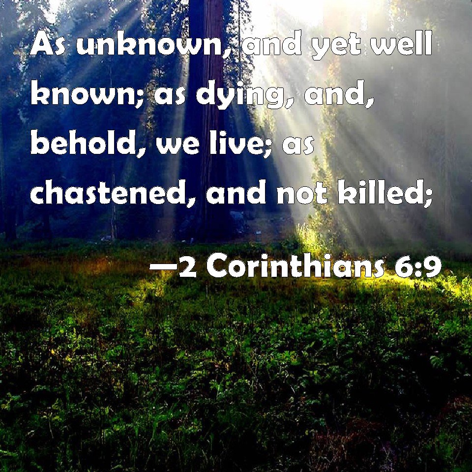 Choose a Background 2 Corinthians 6:9 As unknown, and yet well known; as dying, and, behold, we live; as chastened, and not killed; KJV: As unknown, and yet well known; as dying, and, behold, we live; as chastened, and not killed; DRB: As dying, and behold we live; as chastised, and not killed; DBT: as unknown, and well known; as dying, and behold, we live; as disciplined, and not put to death; ERV: as unknown, and yet well known; as dying, and behold, we live; as chastened, and not killed; WBT: As unknown, and yet well known; as dying, and behold, we live; as chastened, and not killed; WEB: as unknown, and yet well known; as dying, and behold, we live; as punished, and not killed; YLT: as unknown, and recognized; as dying, and lo, we live; as chastened, and not put to death;Links 2 Corinthians 6:9 NIV • 2 Corinthians 6:9 NLT • 2 Corinthians 6:9 ESV • 2 Corinthians 6:9 NASB • 2 Corinthians 6:9 KJV • 2 Corinthians 6:9 Interlinear • 2 Corinthians 6:9 Commentaries • 2 Corinthians 6:9 Parallel Texts • 2 Corinthians 6:9 Bible Apps • 2 Corinthians 6:9 Parallel • Bible Hub |