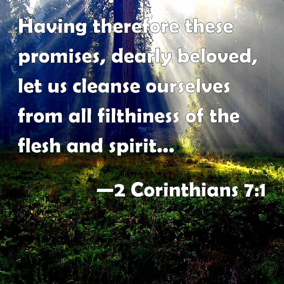 Choose a Background 2 Corinthians 7:1 Having therefore these promises, dearly beloved, let us cleanse ourselves from all filthiness of the flesh and spirit, perfecting holiness in the fear of God. KJV: Having therefore these promises, dearly beloved, let us cleanse ourselves from all filthiness of the flesh and spirit, perfecting holiness in the fear of God. DRB: Having therefore these promises, dearly beloved, let us cleanse ourselves from all defilement of the flesh and of the spirit, perfecting sactification in the fear of God. DBT: Having therefore these promises, beloved, let us purify ourselves from every pollution of flesh and spirit, perfecting holiness in God's fear. ERV: Having therefore these promises, beloved, let us cleanse ourselves from all defilement of flesh and spirit, perfecting holiness in the fear of God. WBT: Having therefore these promises, dearly beloved, let us cleanse ourselves from all filthiness of the flesh and spirit, perfecting holiness in the fear of God. WEB: Having therefore these promises, beloved, let us cleanse ourselves from all defilement of flesh and spirit, perfecting holiness in the fear of God. YLT: Having, then, these promises, beloved, may we cleanse ourselves from every pollution of flesh and spirit, perfecting sanctification in the fear of God;Links 2 Corinthians 7:1 NIV • 2 Corinthians 7:1 NLT • 2 Corinthians 7:1 ESV • 2 Corinthians 7:1 NASB • 2 Corinthians 7:1 KJV • 2 Corinthians 7:1 Interlinear • 2 Corinthians 7:1 Commentaries • 2 Corinthians 7:1 Parallel Texts • 2 Corinthians 7:1 Bible Apps • 2 Corinthians 7:1 Parallel • Bible Hub |