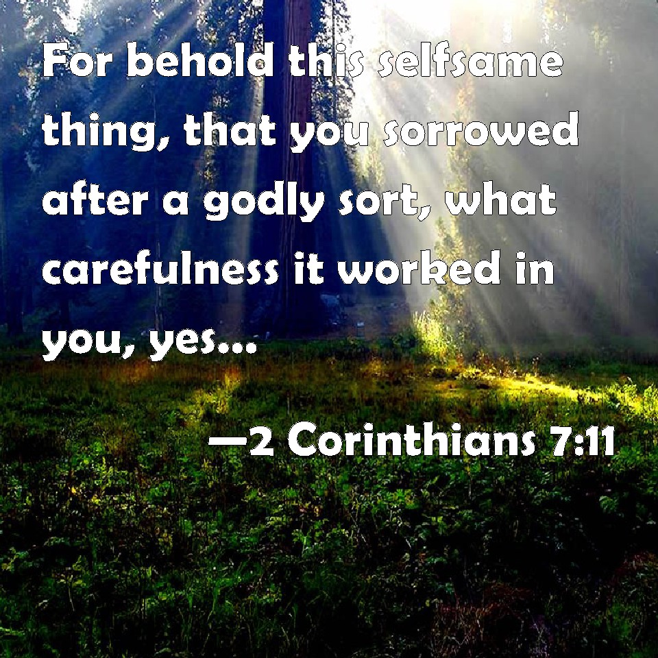 Choose a Background 2 Corinthians 7:11 For behold this selfsame thing, that you sorrowed after a godly sort, what carefulness it worked in you, yes, what clearing of yourselves, yes, what indignation, yes, what fear, yes, what vehement desire, yes, what zeal, yes, what revenge! In all things you have approved yourselves to be clear in this matter. KJV: For behold this selfsame thing, that ye sorrowed after a godly sort, what carefulness it wrought in you, yea, what clearing of yourselves, yea, what indignation, yea, what fear, yea, what vehement desire, yea, what zeal, yea, what revenge! In all things ye have approved yourselves to be clear in this matter. DRB: For behold this selfsame thing, that you were made sorrowful according to God, how great carefulness it worketh in you; yea defence, yea indignation, yea fear, yea desire, yea zeal, yea revenge: in all things you have shewed yourselves to be undefiled in the matter. DBT: For, behold, this same thing, your being grieved according to God, how much diligence it wrought in you, but what excusing of yourselves, but what indignation, but what fear, but what ardent desire, but what zeal, but what vengeance: in every way ye have proved yourselves to be pure in the matter. ERV: For behold, this selfsame thing, that ye were made sorry after a godly sort, what earnest care it wrought in you, yea, what clearing of yourselves, yea, what indignation, yea, what fear, yea, what longing, yea, what zeal, yea, what avenging! In everything ye approved yourselves to be pure in the matter. WBT: For behold this very thing, that ye sorrowed after a godly sort, what carefulness it wrought in you, yea, what clearing of yourselves, yea, what indignation, yea, what fear, yea, what vehement desire, yea, what zeal, yea, what avenging! In all things ye have approved yourselves to be clear in this matter. WEB: For behold, this same thing, that you were made sorry in a godly way, what earnest care it worked in you. Yes, what defense, indignation, fear, longing, zeal, and vengeance! In everything you demonstrated yourselves to be pure in the matter. YLT: for, lo, this same thing — your being made sorry toward God — how much diligence it doth work in you! but defence, but displeasure, but fear, but longing desire, but zeal, but revenge; in every thing ye did approve yourselves to be pure in the matter.Links 2 Corinthians 7:11 NIV • 2 Corinthians 7:11 NLT • 2 Corinthians 7:11 ESV • 2 Corinthians 7:11 NASB • 2 Corinthians 7:11 KJV • 2 Corinthians 7:11 Interlinear • 2 Corinthians 7:11 Commentaries • 2 Corinthians 7:11 Parallel Texts • 2 Corinthians 7:11 Bible Apps • 2 Corinthians 7:11 Parallel • Bible Hub |