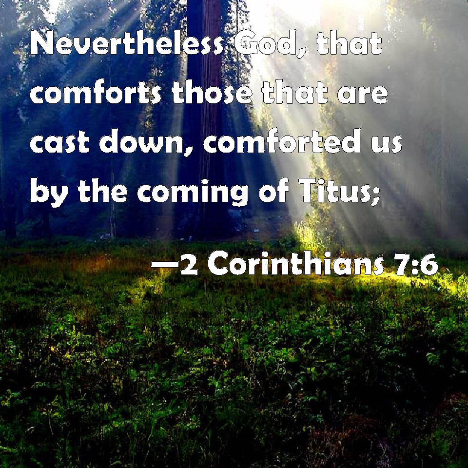 Choose a Background 2 Corinthians 7:6 Nevertheless God, that comforts those that are cast down, comforted us by the coming of Titus; KJV: Nevertheless God, that comforteth those that are cast down, comforted us by the coming of Titus; DRB: But God, who comforteth the humble, comforted us by the coming of Titus. DBT: But he who encourages those that are brought low, even God, encouraged us by the coming of Titus; ERV: Nevertheless he that comforteth the lowly, even God, comforted us by the coming of Titus; WBT: Nevertheless God, that comforteth those that are cast down, comforted us by the coming of Titus; WEB: Nevertheless, he who comforts the lowly, God, comforted us by the coming of Titus; YLT: but He who is comforting the cast-down — God — He did comfort us in the presence of Titus;Links 2 Corinthians 7:6 NIV • 2 Corinthians 7:6 NLT • 2 Corinthians 7:6 ESV • 2 Corinthians 7:6 NASB • 2 Corinthians 7:6 KJV • 2 Corinthians 7:6 Interlinear • 2 Corinthians 7:6 Commentaries • 2 Corinthians 7:6 Parallel Texts • 2 Corinthians 7:6 Bible Apps • 2 Corinthians 7:6 Parallel • Bible Hub |
