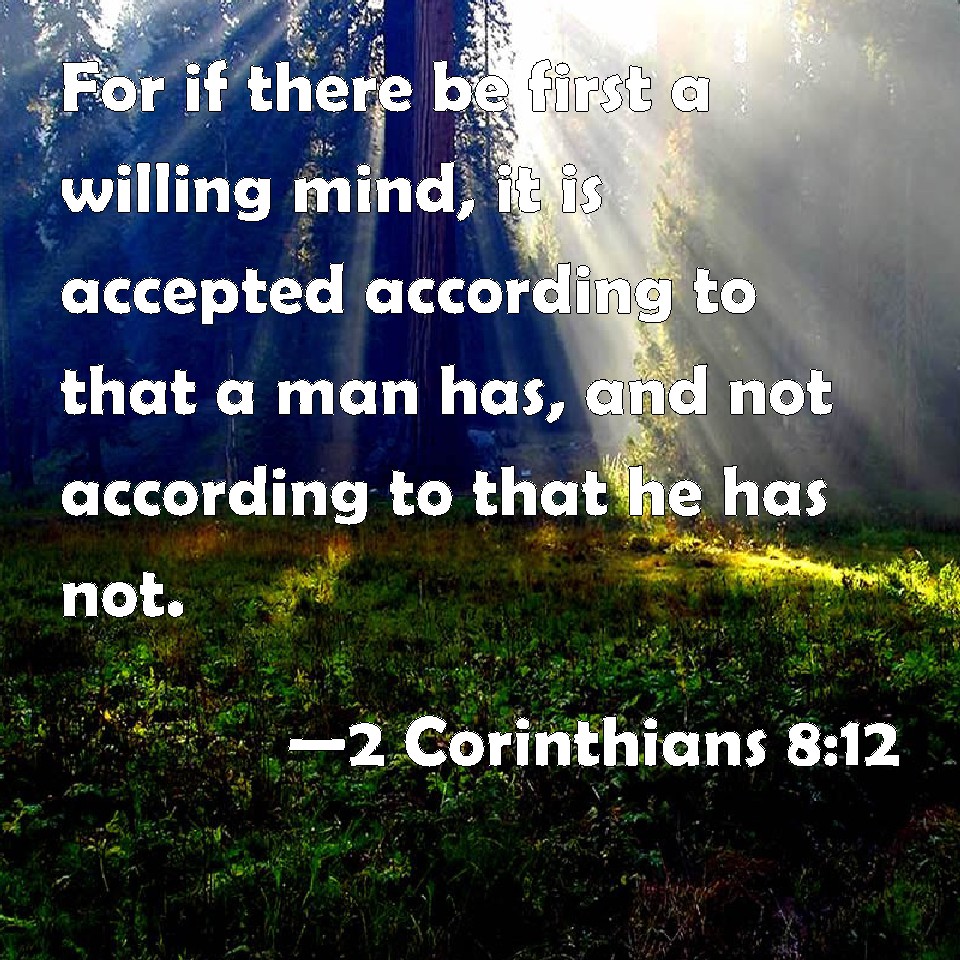 Choose a Background 2 Corinthians 8:12 For if there be first a willing mind, it is accepted according to that a man has, and not according to that he has not. KJV: For if there be first a willing mind, it is accepted according to that a man hath, and not according to that he hath not. DRB: For if the will be forward, it is accepted according to that which a man hath, not according to that which he hath not. DBT: For if the readiness be there, a man is accepted according to what he may have, not according to what he has not. ERV: For if the readiness is there, it is acceptable according as a man hath, not according as he hath not. WBT: For if there is first a willing mind, it is accepted according to what a man hath, and not according to what he hath not. WEB: For if the readiness is there, it is acceptable according to what you have, not according to what you don't have. YLT: for if the willing mind is present, according to that which any one may have it is well-accepted, not according to that which he hath not;Links 2 Corinthians 8:12 NIV • 2 Corinthians 8:12 NLT • 2 Corinthians 8:12 ESV • 2 Corinthians 8:12 NASB • 2 Corinthians 8:12 KJV • 2 Corinthians 8:12 Interlinear • 2 Corinthians 8:12 Commentaries • 2 Corinthians 8:12 Parallel Texts • 2 Corinthians 8:12 Bible Apps • 2 Corinthians 8:12 Parallel • Bible Hub |