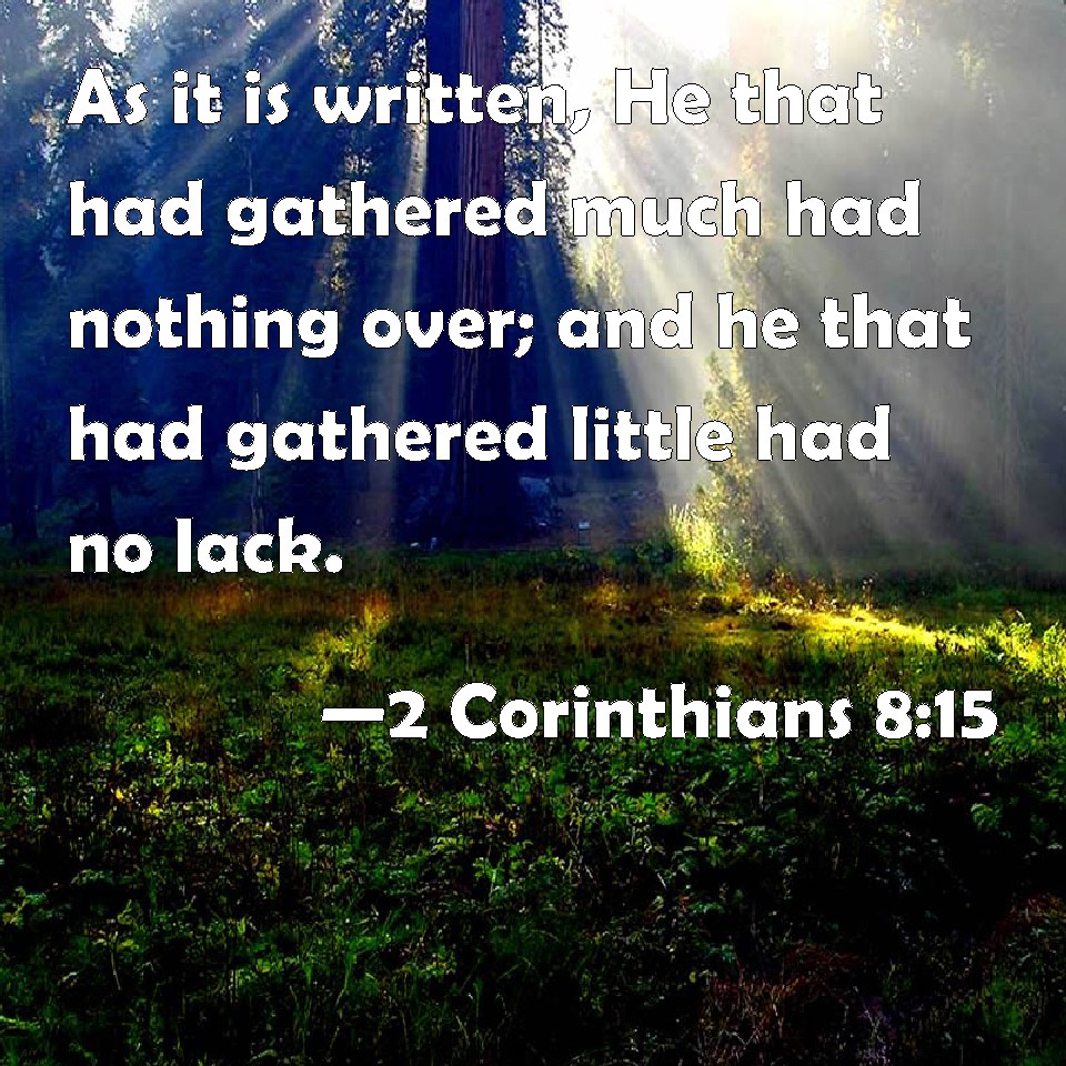 Choose a Background 2 Corinthians 8:15 As it is written, He that had gathered much had nothing over; and he that had gathered little had no lack. KJV: As it is written, He that had gathered much had nothing over; and he that had gathered little had no lack. DRB: As it is written: He that had much, had nothing over; and he that had little, had no want. DBT: According as it is written, He who gathered much had no excess, and he who gathered little was nothing short. ERV: as it is written, He that gathered much had nothing over; and he that gathered little had no lack. WBT: As it is written, He that had gathered much had nothing over; and he that had gathered little had no want. WEB: As it is written, "He who gathered much had nothing left over, and he who gathered little had no lack." YLT: according as it hath been written, 'He who did gather much, had nothing over; and he who did gather little, had no lack.'Links 2 Corinthians 8:15 NIV • 2 Corinthians 8:15 NLT • 2 Corinthians 8:15 ESV • 2 Corinthians 8:15 NASB • 2 Corinthians 8:15 KJV • 2 Corinthians 8:15 Interlinear • 2 Corinthians 8:15 Commentaries • 2 Corinthians 8:15 Parallel Texts • 2 Corinthians 8:15 Bible Apps • 2 Corinthians 8:15 Parallel • Bible Hub |