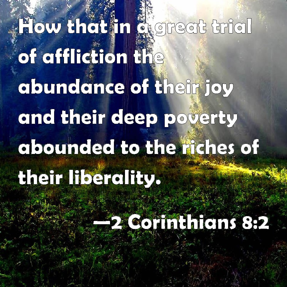 2 Corinthians 8:2 How that in a great trial of affliction the abundance of their joy and their deep poverty abounded to the riches of their liberality.