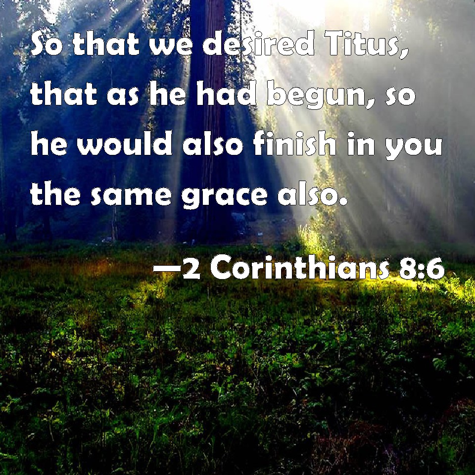 Choose a Background 2 Corinthians 8:6 So that we desired Titus, that as he had begun, so he would also finish in you the same grace also. KJV: Insomuch that we desired Titus, that as he had begun, so he would also finish in you the same grace also. DRB: Insomuch, that we desired Titus, that as he had begun, so also he would finish among you this same grace. DBT: So that we begged Titus that, according as he had before begun, so he would also complete as to you this grace also; ERV: Insomuch that we exhorted Titus, that as he had made a beginning before, so he would also complete in you this grace also. WBT: So that we desired Titus, that as he had begun, so he would also finish in you the same grace also. WEB: So we urged Titus, that as he made a beginning before, so he would also complete in you this grace. YLT: so that we exhorted Titus, that, according as he did begin before, so also he may finish to you also this favour,Links 2 Corinthians 8:6 NIV • 2 Corinthians 8:6 NLT • 2 Corinthians 8:6 ESV • 2 Corinthians 8:6 NASB • 2 Corinthians 8:6 KJV • 2 Corinthians 8:6 Interlinear • 2 Corinthians 8:6 Commentaries • 2 Corinthians 8:6 Parallel Texts • 2 Corinthians 8:6 Bible Apps • 2 Corinthians 8:6 Parallel • Bible Hub |
