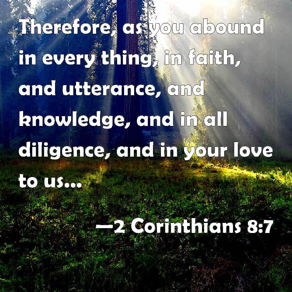 Choose a Background 2 Corinthians 8:7 Therefore, as you abound in every thing, in faith, and utterance, and knowledge, and in all diligence, and in your love to us, see that you abound in this grace also. KJV: Therefore, as ye abound in every thing, in faith, and utterance, and knowledge, and in all diligence, and in your love to us, see that ye abound in this grace also. DRB: That as in all things you abound in faith, and word, and knowledge, and all carefulness; moreover also in your charity towards us, so in this grace also you may abound. DBT: but even as ye abound in every way, in faith, and word, and knowledge, and all diligence, and in love from you to us, that ye may abound in this grace also. ERV: But as ye abound in everything, in faith, and utterance, and knowledge, and in all earnestness, and in your love to us, see that ye abound in this grace also. WBT: Therefore, as ye abound in every thing, in faith and utterance, and knowledge, and in all diligence, and in your love to us, see that ye abound in this grace also. WEB: But as you abound in everything, in faith, utterance, knowledge, all earnestness, and in your love to us, see that you also abound in this grace. YLT: but even as in every thing ye do abound, in faith, and word, and knowledge, and all diligence, and in your love to us, that also in this grace ye may abound;Links 2 Corinthians 8:7 NIV • 2 Corinthians 8:7 NLT • 2 Corinthians 8:7 ESV • 2 Corinthians 8:7 NASB • 2 Corinthians 8:7 KJV • 2 Corinthians 8:7 Interlinear • 2 Corinthians 8:7 Commentaries • 2 Corinthians 8:7 Parallel Texts • 2 Corinthians 8:7 Bible Apps • 2 Corinthians 8:7 Parallel • Bible Hub |