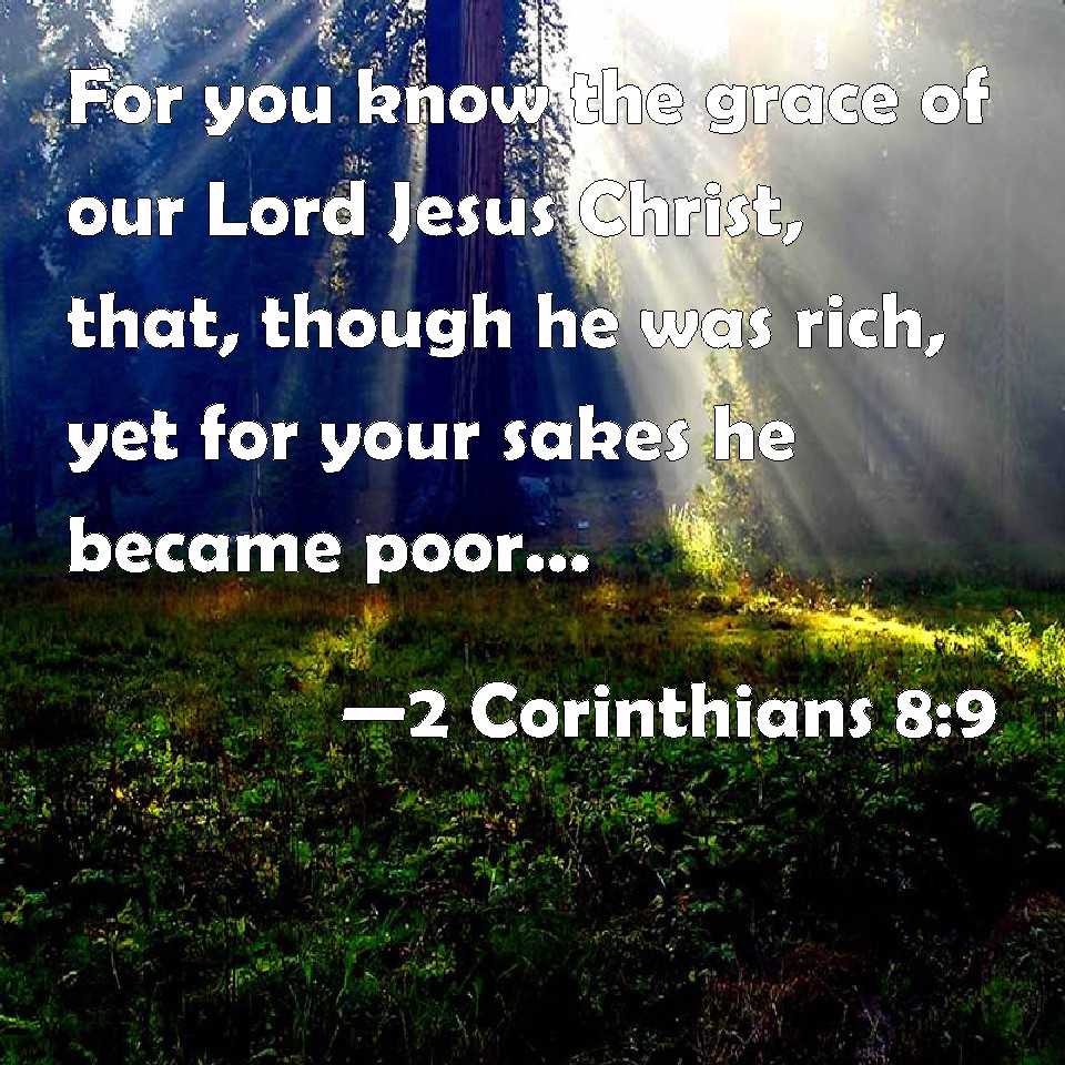 Choose a Background 2 Corinthians 8:9 For you know the grace of our Lord Jesus Christ, that, though he was rich, yet for your sakes he became poor, that you through his poverty might be rich. KJV: For ye know the grace of our Lord Jesus Christ, that, though he was rich, yet for your sakes he became poor, that ye through his poverty might be rich. DRB: For you know the grace of our Lord Jesus Christ, that being rich he became poor, for your sakes; that through his poverty you might be rich. DBT: For ye know the grace of our Lord Jesus Christ, that for your sakes he, being rich, became poor, in order that ye by his poverty might be enriched. ERV: For ye know the grace of our Lord Jesus Christ, that, though he was rich, yet for your sakes he became poor, that ye through his poverty might become rich. WBT: For ye know the grace of our Lord Jesus Christ, that though he was rich, yet for your sakes he became poor, that ye through his poverty might be rich. WEB: For you know the grace of our Lord Jesus Christ, that, though he was rich, yet for your sakes he became poor, that you through his poverty might become rich. YLT: for ye know the grace of our Lord Jesus Christ, that because of you he became poor — being rich, that ye by that poverty may become rich.Links 2 Corinthians 8:9 NIV • 2 Corinthians 8:9 NLT • 2 Corinthians 8:9 ESV • 2 Corinthians 8:9 NASB • 2 Corinthians 8:9 KJV • 2 Corinthians 8:9 Interlinear • 2 Corinthians 8:9 Commentaries • 2 Corinthians 8:9 Parallel Texts • 2 Corinthians 8:9 Bible Apps • 2 Corinthians 8:9 Parallel • Bible Hub |