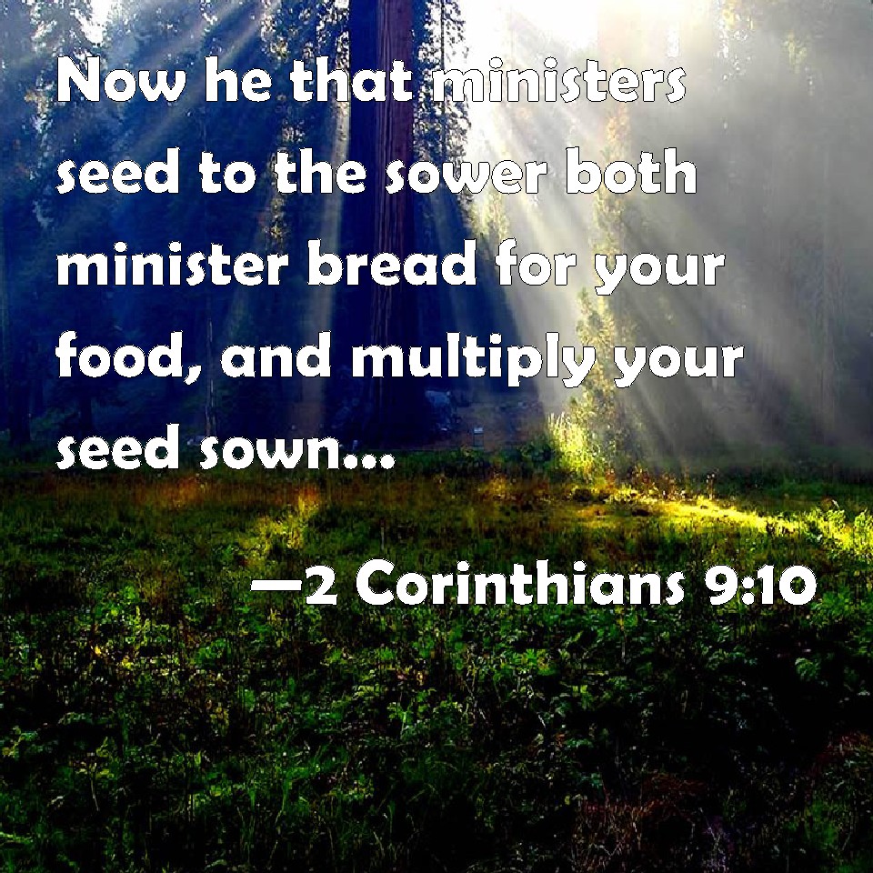 Choose a Background 2 Corinthians 9:10 Now he that ministers seed to the sower both minister bread for your food, and multiply your seed sown, and increase the fruits of your righteousness;) KJV: Now he that ministereth seed to the sower both minister bread for your food, and multiply your seed sown, and increase the fruits of your righteousness;) DRB: And he that ministereth seed to the sower, will both give you bread to eat, and will multiply your seed, and increase the growth of the fruits of your justice: DBT: Now he that supplies seed to the sower and bread for eating shall supply and make abundant your sowing, and increase the fruits of your righteousness: ERV: And he that supplieth seed to the sower and bread for food, shall supply and multiply your seed for sowing, and increase the fruits of your righteousness: WBT: Now may he that ministereth seed to the sower, both minister bread for your food, and multiply your seed sown, and increase the fruits of your righteousness;) WEB: Now may he who supplies seed to the sower and bread for food, supply and multiply your seed for sowing, and increase the fruits of your righteousness; YLT: and may He who is supplying seed to the sower, and bread for food, supply and multiply your seed sown, and increase the fruits of your righteousness,Links 2 Corinthians 9:10 NIV • 2 Corinthians 9:10 NLT • 2 Corinthians 9:10 ESV • 2 Corinthians 9:10 NASB • 2 Corinthians 9:10 KJV • 2 Corinthians 9:10 Interlinear • 2 Corinthians 9:10 Commentaries • 2 Corinthians 9:10 Parallel Texts • 2 Corinthians 9:10 Bible Apps • 2 Corinthians 9:10 Parallel • Bible Hub |