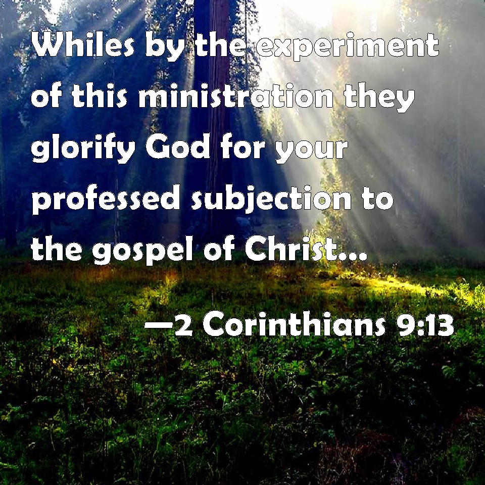 Choose a Background 2 Corinthians 9:13 Whiles by the experiment of this ministration they glorify God for your professed subjection to the gospel of Christ, and for your liberal distribution to them, and to all men; KJV: Whiles by the experiment of this ministration they glorify God for your professed subjection unto the gospel of Christ, and for your liberal distribution unto them, and unto all men; DRB: By the proof of this ministry, glorifying God for the obedience of your confession unto the gospel of Christ, and for the simplicity of your communicating unto them, and unto all. DBT: they glorifying God through the proof of this ministration, by reason of your subjection, by profession, to the glad tidings of the Christ, and your free-hearted liberality in communicating towards them and towards all; ERV: seeing that through the proving of you by this ministration they glorify God for the obedience of your confession unto the gospel of Christ, and for the liberality of your contribution unto them and unto all; WBT: While by the experiment of this ministration they glorify God for your professed subjection to the gospel of Christ, and for your liberal distribution to them, and to all men; WEB: seeing that through the proof given by this service, they glorify God for the obedience of your confession to the Good News of Christ, and for the liberality of your contribution to them and to all; YLT: through the proof of this ministration glorifying God for the subjection of your confession to the good news of the Christ, and for the liberality of the fellowship to them and to all,Links 2 Corinthians 9:13 NIV • 2 Corinthians 9:13 NLT • 2 Corinthians 9:13 ESV • 2 Corinthians 9:13 NASB • 2 Corinthians 9:13 KJV • 2 Corinthians 9:13 Interlinear • 2 Corinthians 9:13 Commentaries • 2 Corinthians 9:13 Parallel Texts • 2 Corinthians 9:13 Bible Apps • 2 Corinthians 9:13 Parallel • Bible Hub |
