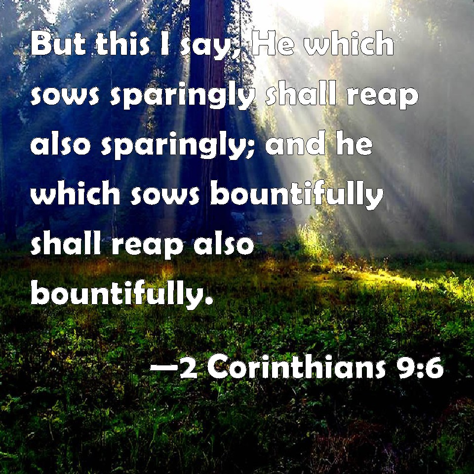 Choose a Background 2 Corinthians 9:6 But this I say, He which sows sparingly shall reap also sparingly; and he which sows bountifully shall reap also bountifully. KJV: But this I say, He which soweth sparingly shall reap also sparingly; and he which soweth bountifully shall reap also bountifully. DRB: Now this I say: He who soweth sparingly, shall also reap sparingly: and he who soweth in blessings, shall also reap blessings. DBT: But this is true, he that sows sparingly shall reap also sparingly; and he that sows in the spirit of blessing shall reap also in blessing: ERV: But this I say, He that soweth sparingly shall reap also sparingly; and he that soweth bountifully shall reap also bountifully. WBT: But this I say, He who soweth sparingly, shall reap also sparingly; and he who soweth bountifully, shall reap also bountifully. WEB: Remember this: he who sows sparingly will also reap sparingly. He who sows bountifully will also reap bountifully. YLT: And this: He who is sowing sparingly, sparingly also shall reap; and he who is sowing in blessings, in blessings also shall reap;Links 2 Corinthians 9:6 NIV • 2 Corinthians 9:6 NLT • 2 Corinthians 9:6 ESV • 2 Corinthians 9:6 NASB • 2 Corinthians 9:6 KJV • 2 Corinthians 9:6 Interlinear • 2 Corinthians 9:6 Commentaries • 2 Corinthians 9:6 Parallel Texts • 2 Corinthians 9:6 Bible Apps • 2 Corinthians 9:6 Parallel • Bible Hub |