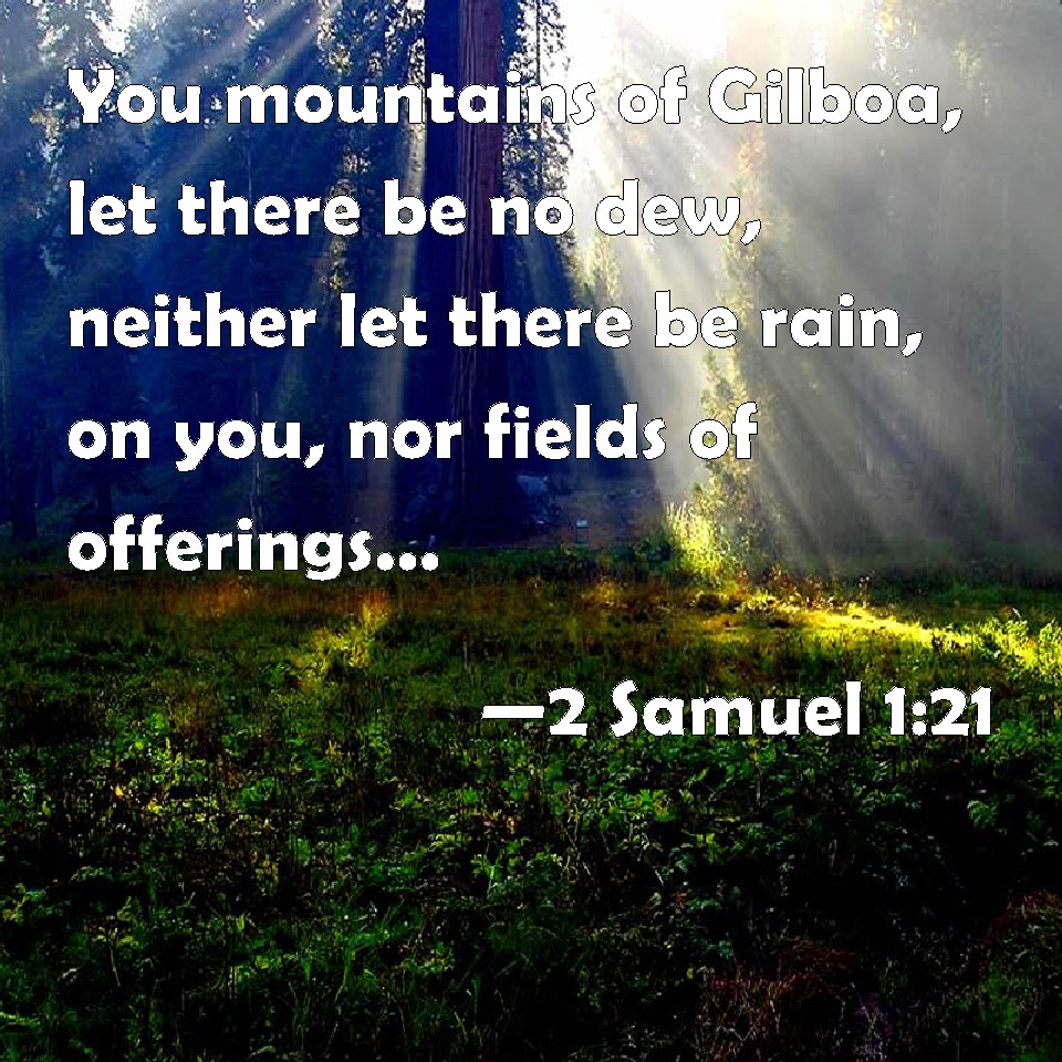 Choose a Background 2 Samuel 1:21 You mountains of Gilboa, let there be no dew, neither let there be rain, on you, nor fields of offerings: for there the shield of the mighty is vilely cast away, the shield of Saul, as though he had not been anointed with oil. KJV: Ye mountains of Gilboa, let there be no dew, neither let there be rain, upon you, nor fields of offerings: for there the shield of the mighty is vilely cast away, the shield of Saul, as though he had not been anointed with oil. DRB: Ye mountains of Gelboe, let neither dew, nor rain come upon you, neither be they fields of firstfruits: for there was cast away the shield of the valiant, the shield of Saul as though he had not been anointed with oil. DBT: Ye mountains of Gilboa, let there be no dew, no rain upon you, nor fields of heave-offerings! For there the shield of the mighty was vilely cast away, The shield of Saul, as not anointed with oil. ERV: Ye mountains of Gilboa, let there be no dew nor rain upon you, neither fields of offerings: for there the shield of the mighty was vilely cast away, the shield of Saul, not anointed with oil. WBT: Ye mountains of Gilboa, let there be no dew, neither rain upon you, nor fields of offerings: for there the shield of the mighty is vilely cast away, the shield of Saul, as though he had not been anointed with oil. WEB: You mountains of Gilboa, let there be no dew nor rain on you, neither fields of offerings; For there the shield of the mighty was vilely cast away, The shield of Saul was not anointed with oil. YLT: Mountains of Gilboa! No dew nor rain be on you, And fields of heave-offerings! For there hath become loathsome The shield of the mighty, The shield of Saul — without the anointed with oil.Links 2 Samuel 1:21 NIV • 2 Samuel 1:21 NLT • 2 Samuel 1:21 ESV • 2 Samuel 1:21 NASB • 2 Samuel 1:21 KJV • 2 Samuel 1:21 Interlinear • 2 Samuel 1:21 Commentaries • 2 Samuel 1:21 Parallel Texts • 2 Samuel 1:21 Bible Apps • 2 Samuel 1:21 Parallel • Bible Hub |
