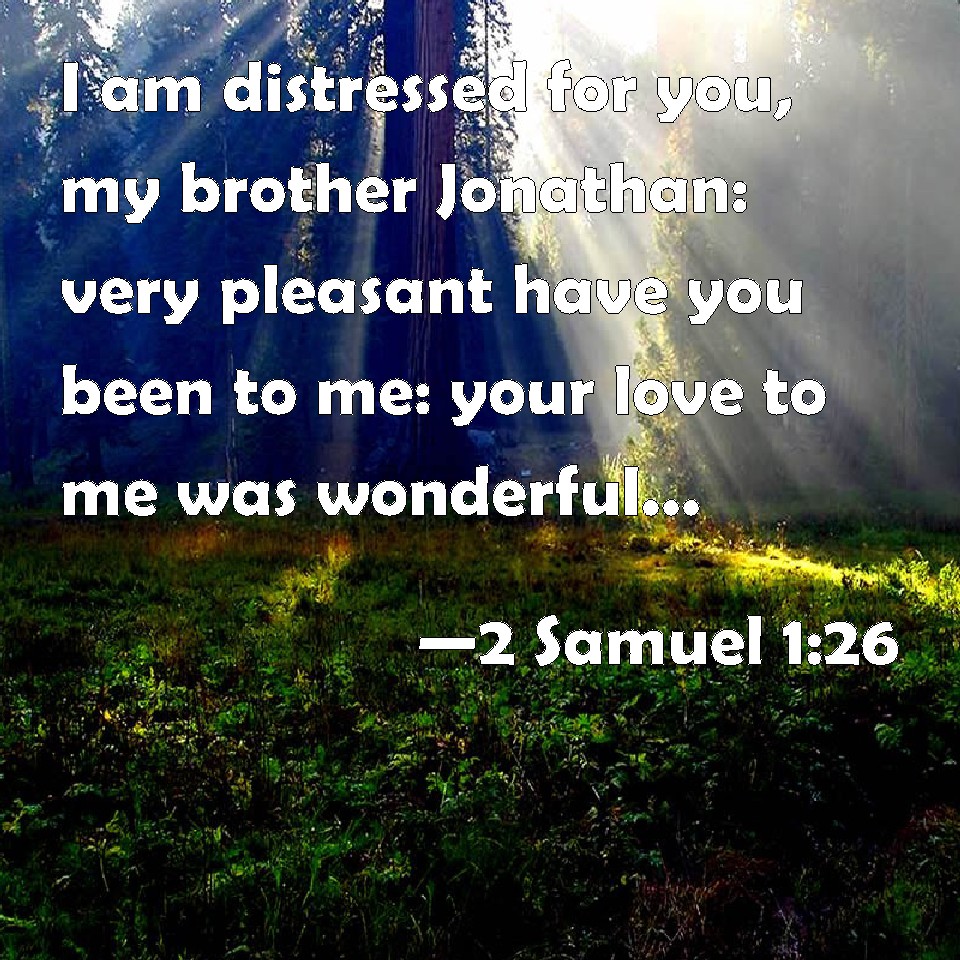 Choose a Background 2 Samuel 1:26 I am distressed for you, my brother Jonathan: very pleasant have you been to me: your love to me was wonderful, passing the love of women. KJV: I am distressed for thee, my brother Jonathan: very pleasant hast thou been unto me: thy love to me was wonderful, passing the love of women. DRB: I grieve for thee, my brother Jonathan: exceeding beautiful, and amiable to me above the love of women. As the mother loveth her only son, so did I love thee. DBT: I am distressed for thee, my brother Jonathan: very pleasant wast thou unto me; Thy love to me was wonderful, passing women's love. ERV: I am distressed for thee, my brother Jonathan: very pleasant hast thou been unto me: thy love to me was wonderful, passing the love of women. WBT: I am distressed for thee, my brother Jonathan: very pleasant hast thou been to me: thy love to me was wonderful, passing the love of women. WEB: I am distressed for you, my brother Jonathan. You have been very pleasant to me. Your love to me was wonderful, passing the love of women. YLT: I am in distress for thee, my brother Jonathan, Very pleasant wast thou to me; Wonderful was thy love to me, Above the love of women!Links 2 Samuel 1:26 NIV • 2 Samuel 1:26 NLT • 2 Samuel 1:26 ESV • 2 Samuel 1:26 NASB • 2 Samuel 1:26 KJV • 2 Samuel 1:26 Interlinear • 2 Samuel 1:26 Commentaries • 2 Samuel 1:26 Parallel Texts • 2 Samuel 1:26 Bible Apps • 2 Samuel 1:26 Parallel • Bible Hub |