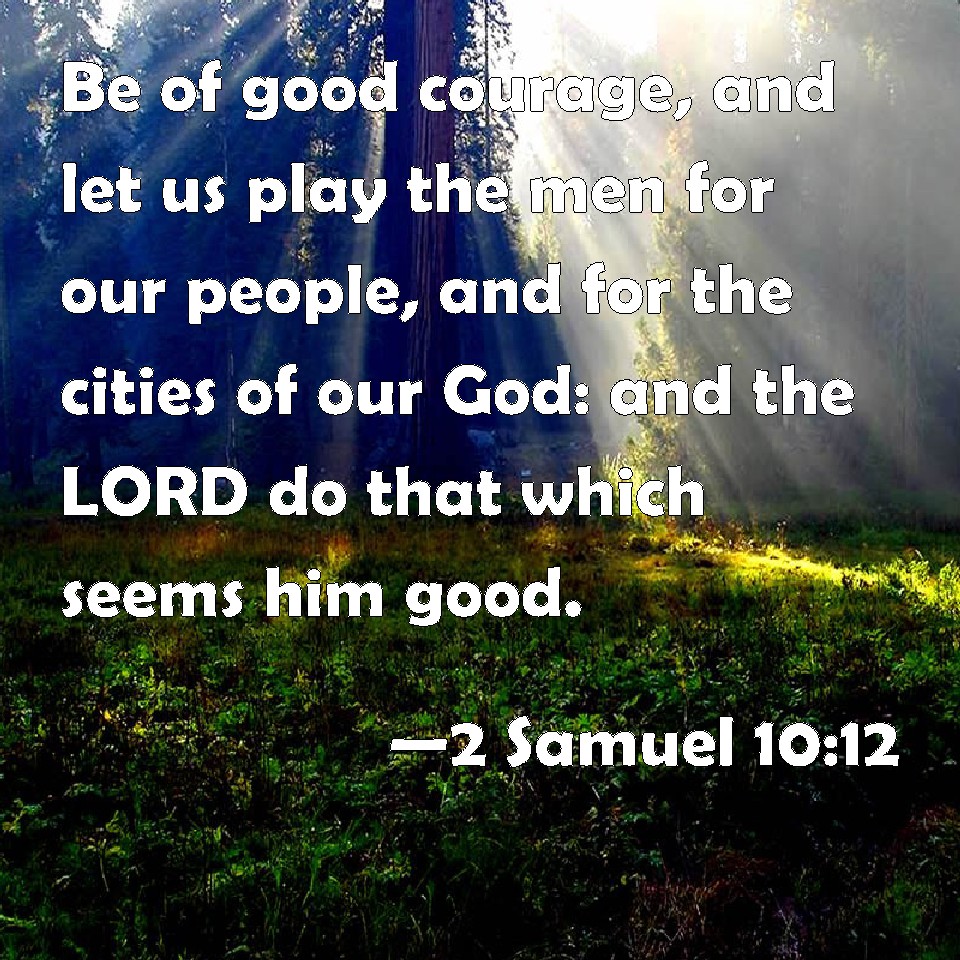 Choose a Background 2 Samuel 10:12 Be of good courage, and let us play the men for our people, and for the cities of our God: and the LORD do that which seems him good. KJV: Be of good courage, and let us play the men for our people, and for the cities of our God: and the LORD do that which seemeth him good. DRB: Be of good courage, and let us fight for our people, and for the city of our God: and the Lord will do what is good in his sight. DBT: Be strong, and let us shew ourselves valiant for our people and for the cities of our God; and Jehovah do what is good in his sight. ERV: Be of good courage, and let us play the men for our people, and for the cities of our God: and the LORD do that which seemeth him good. WBT: Be of good courage, and let us play the men for our people, and for the cities of our God: and the LORD do that which seemeth him good. WEB: Be courageous, and let us be strong for our people, and for the cities of our God; and Yahweh do that which seems good to him." YLT: be strong and strengthen thyself for our people, and for the cities of our God, and Jehovah doth that which is good in His eyes.'Links 2 Samuel 10:12 NIV • 2 Samuel 10:12 NLT • 2 Samuel 10:12 ESV • 2 Samuel 10:12 NASB • 2 Samuel 10:12 KJV • 2 Samuel 10:12 Interlinear • 2 Samuel 10:12 Commentaries • 2 Samuel 10:12 Parallel Texts • 2 Samuel 10:12 Bible Apps • 2 Samuel 10:12 Parallel • Bible Hub |