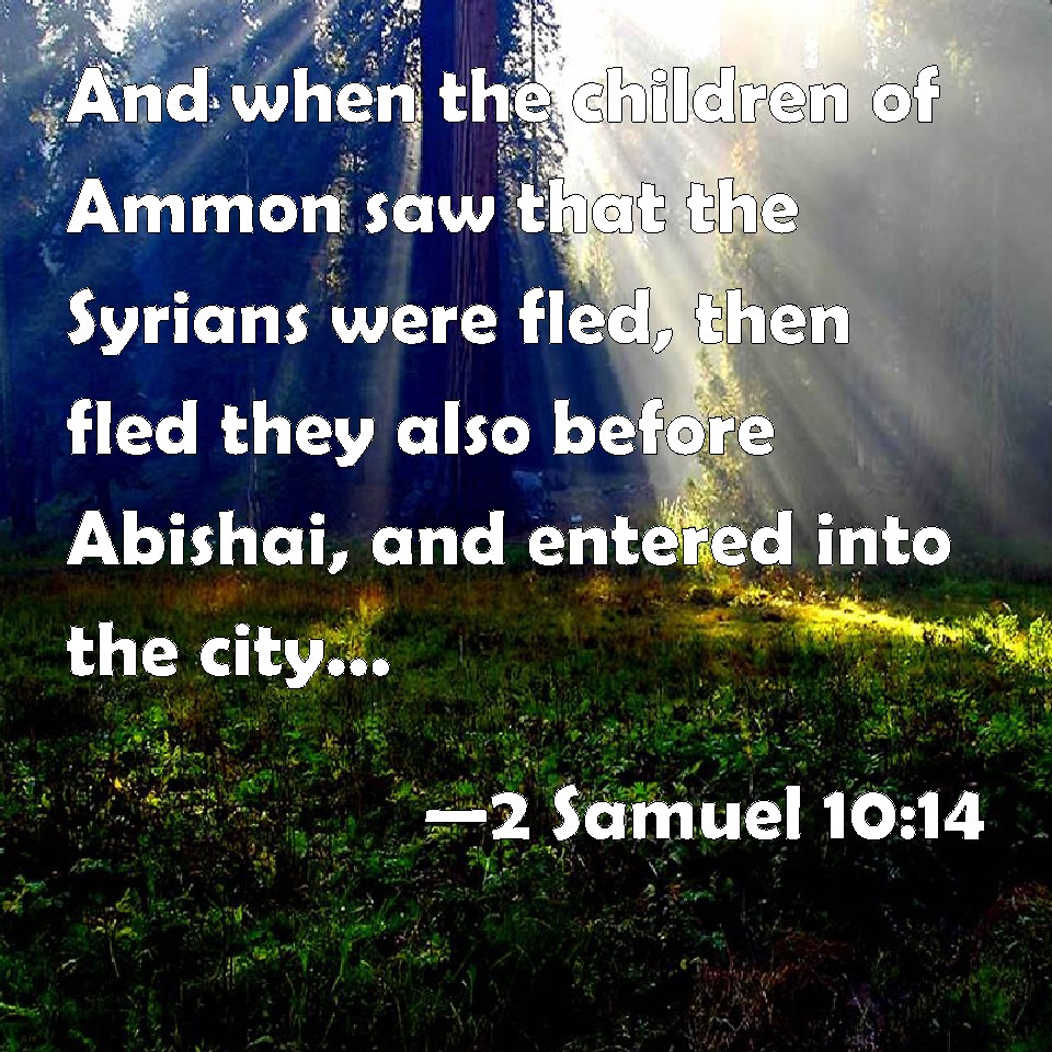 Choose a Background 2 Samuel 10:14 And when the children of Ammon saw that the Syrians were fled, then fled they also before Abishai, and entered into the city. So Joab returned from the children of Ammon, and came to Jerusalem. KJV: And when the children of Ammon saw that the Syrians were fled, then fled they also before Abishai, and entered into the city. So Joab returned from the children of Ammon, and came to Jerusalem. DRB: And the children of Ammon seeing that the Syrians were fled, they fled also before Abisai, and entered into the city: and Joab returned from the children of Ammon, and came to Jerusalem. DBT: And when the children of Ammon saw that the Syrians fled, they fled before Abishai, and entered into the city. And Joab returned from the children of Ammon, and came to Jerusalem. ERV: And when the children of Ammon saw that the Syrians were fled, they likewise fled before Abishai, and entered into the city. Then Joab returned from the children of Ammon, and came to Jerusalem. WBT: And when the children of Ammon saw that the Syrians had fled, then fled they also before Abishai, and entered into the city. So Joab returned from the children of Ammon, and came to Jerusalem. WEB: When the children of Ammon saw that the Syrians had fled, they likewise fled before Abishai, and entered into the city. Then Joab returned from the children of Ammon, and came to Jerusalem. YLT: and the Bene-Ammon have seen that Aram hath fled, and they flee from the presence of Abishai, and go in to the city; and Joab turneth back from the Bene-Ammon, and cometh in to Jerusalem.Links 2 Samuel 10:14 NIV • 2 Samuel 10:14 NLT • 2 Samuel 10:14 ESV • 2 Samuel 10:14 NASB • 2 Samuel 10:14 KJV • 2 Samuel 10:14 Interlinear • 2 Samuel 10:14 Commentaries • 2 Samuel 10:14 Parallel Texts • 2 Samuel 10:14 Bible Apps • 2 Samuel 10:14 Parallel • Bible Hub |