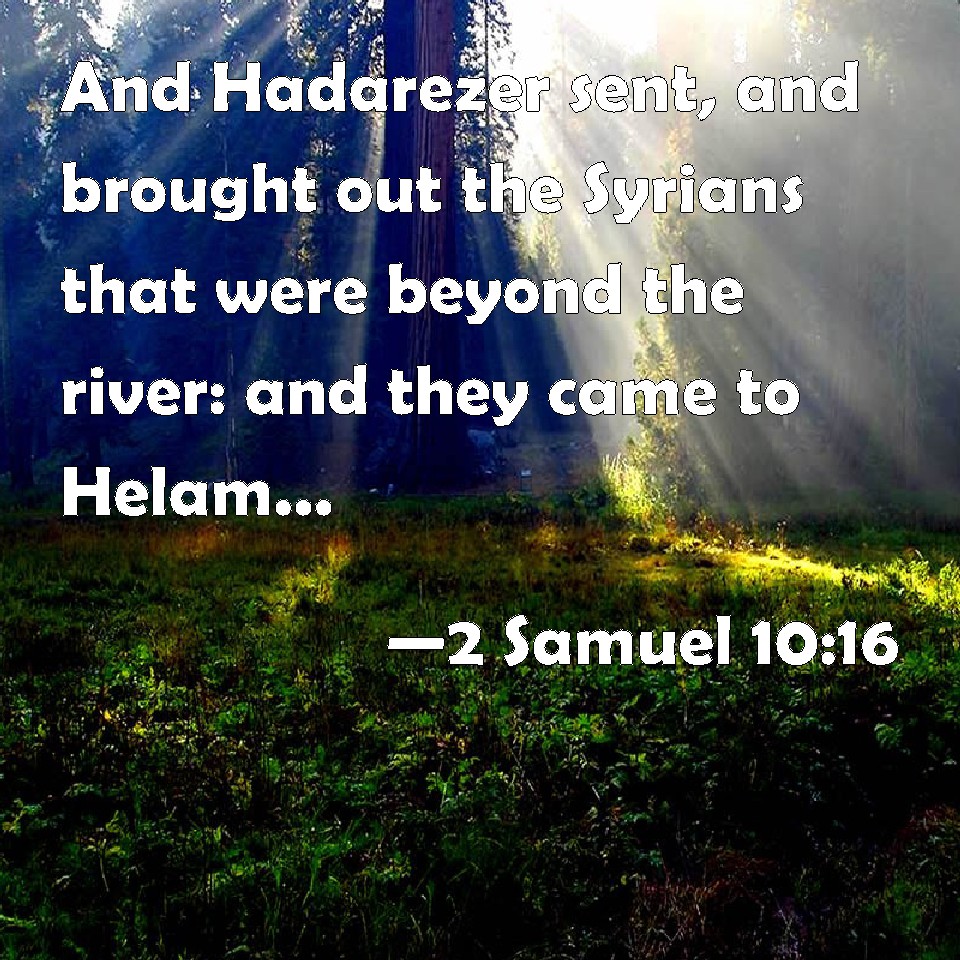 Choose a Background 2 Samuel 10:16 And Hadarezer sent, and brought out the Syrians that were beyond the river: and they came to Helam; and Shobach the captain of the host of Hadarezer went before them. KJV: And Hadarezer sent, and brought out the Syrians that were beyond the river: and they came to Helam; and Shobach the captain of the host of Hadarezer went before them. DRB: And Adarezer sent and fetched the Syrians, that were beyond the river, and brought over their army: and Sobach, the captain of the host of Adarezer, was their general. DBT: And Hadarezer sent, and drew forth the Syrians that were beyond the river; and they came to Helam; and Shobach the captain of the host of Hadarezer went before them. ERV: And Hadarezer sent, and brought out the Syrians that were beyond the River: and they came to Helam, with Shobach the captain of the host of Hadarezer at their head. WBT: And Hadarezer sent, and brought out the Syrians that were beyond the river: and they came to Helam; and Shobach the captain of the host of Hadarezer went before them. WEB: Hadadezer sent, and brought out the Syrians who were beyond the River: and they came to Helam, with Shobach the captain of the army of Hadadezer at their head. YLT: and Hadadezer sendeth, and bringeth out Aram which is beyond the River, and they come in to Helam, and Shobach head of the host of Hadadezer is before them.Links 2 Samuel 10:16 NIV • 2 Samuel 10:16 NLT • 2 Samuel 10:16 ESV • 2 Samuel 10:16 NASB • 2 Samuel 10:16 KJV • 2 Samuel 10:16 Interlinear • 2 Samuel 10:16 Commentaries • 2 Samuel 10:16 Parallel Texts • 2 Samuel 10:16 Bible Apps • 2 Samuel 10:16 Parallel • Bible Hub |