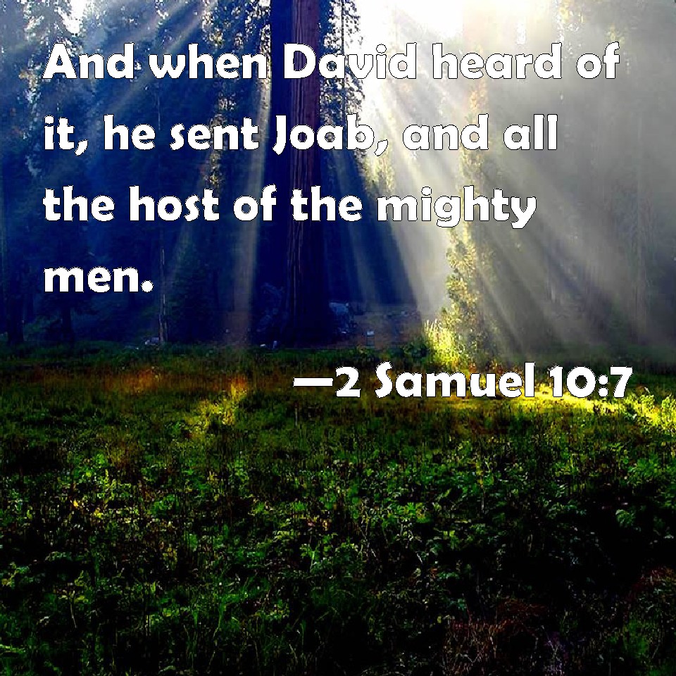 Choose a Background 2 Samuel 10:7 And when David heard of it, he sent Joab, and all the host of the mighty men. KJV: And when David heard of it, he sent Joab, and all the host of the mighty men. DRB: And when David heard this, he sent Joab and the whole army of warriors. DBT: And David heard of it, and he sent Joab, and all the host, the mighty men. ERV: And when David heard of it, he sent Joab, and all the host of the mighty men. WBT: And when David heard of it, he sent Joab, and all the host of the mighty men. WEB: When David heard of it, he sent Joab, and all the army of the mighty men. YLT: and David heareth, and sendeth Joab, and all the host — the mighty men.Links 2 Samuel 10:7 NIV • 2 Samuel 10:7 NLT • 2 Samuel 10:7 ESV • 2 Samuel 10:7 NASB • 2 Samuel 10:7 KJV • 2 Samuel 10:7 Interlinear • 2 Samuel 10:7 Commentaries • 2 Samuel 10:7 Parallel Texts • 2 Samuel 10:7 Bible Apps • 2 Samuel 10:7 Parallel • Bible Hub |