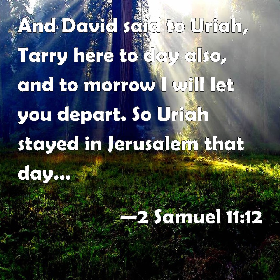 Choose a Background 2 Samuel 11:12 And David said to Uriah, Tarry here to day also, and to morrow I will let you depart. So Uriah stayed in Jerusalem that day, and the morrow. KJV: And David said to Uriah, Tarry here to day also, and to morrow I will let thee depart. So Uriah abode in Jerusalem that day, and the morrow. DRB: Then David said to Urias: Tarry here to day, and to morrow I will send thee away. Urias tarried in Jerusalem that day and the next. DBT: And David said to Urijah, Abide here to-day also, and to-morrow I will let thee depart. And Urijah abode in Jerusalem that day and the morrow. ERV: And David said to Uriah, Tarry here today also, and tomorrow I will let thee depart. So Uriah abode in Jerusalem that day, and the morrow. WBT: And David said to Uriah, Tarry here to-day also, and to-morrow I will let thee depart. So Uriah abode in Jerusalem that day and the morrow. WEB: David said to Uriah, "Stay here today also, and tomorrow I will let you depart." So Uriah stayed in Jerusalem that day, and the next day. YLT: And David saith unto Uriah, 'Abide in this place also to-day, and to-morrow I send thee away;' and Uriah abideth in Jerusalem, on that day, and on the morrow,Links 2 Samuel 11:12 NIV • 2 Samuel 11:12 NLT • 2 Samuel 11:12 ESV • 2 Samuel 11:12 NASB • 2 Samuel 11:12 KJV • 2 Samuel 11:12 Interlinear • 2 Samuel 11:12 Commentaries • 2 Samuel 11:12 Parallel Texts • 2 Samuel 11:12 Bible Apps • 2 Samuel 11:12 Parallel • Bible Hub |
