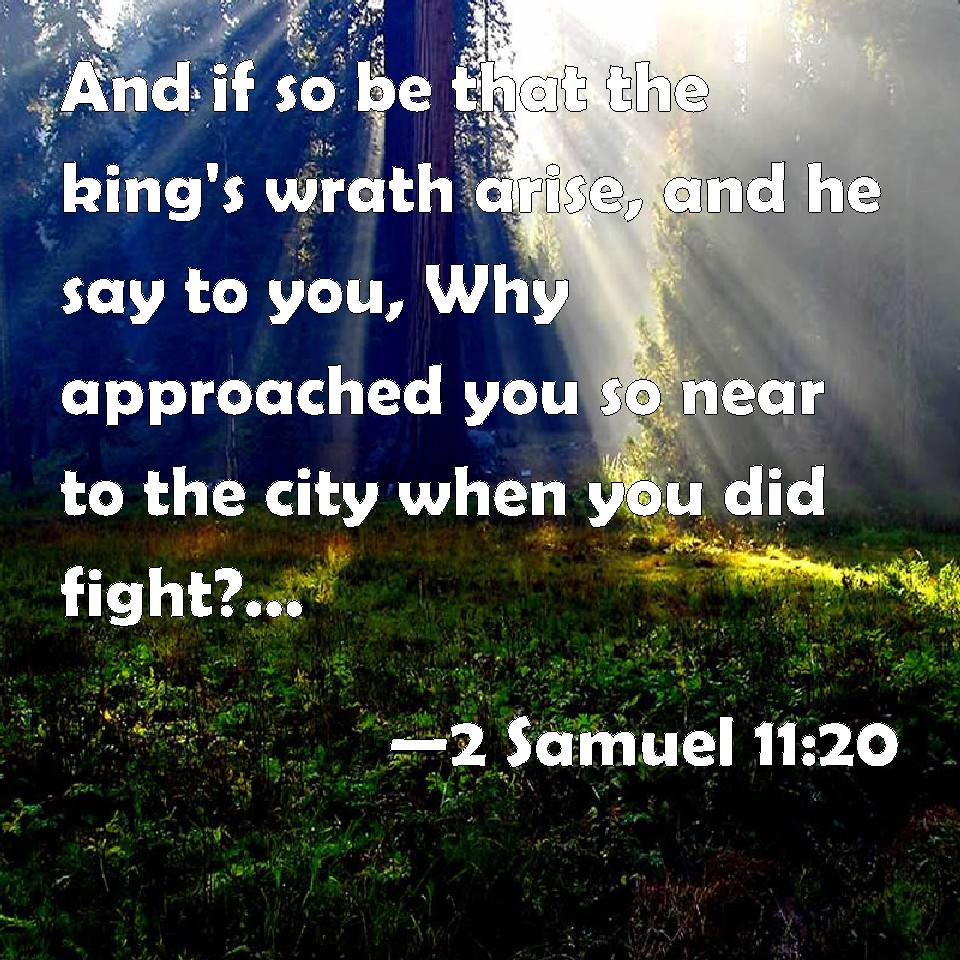 Choose a Background 2 Samuel 11:20 And if so be that the king's wrath arise, and he say to you, Why approached you so near to the city when you did fight? knew you not that they would shoot from the wall? KJV: And if so be that the king's wrath arise, and he say unto thee, Wherefore approached ye so nigh unto the city when ye did fight? knew ye not that they would shoot from the wall? DRB: If thou see him to be angry, and he shall say: Why did you approach so near to the wall to fight? knew you not that many darts are thrown from above off the wall? DBT: and if so be that the king's wrath arise, and he say to thee, Why did ye go so near to the city to fight? did ye not know that they would shoot from the wall? ERV: it shall be that, if the king's wrath arise, and he say unto thee, Wherefore went ye so nigh unto the city to fight? knew ye not that they would shoot from the wall? WBT: And if the king's wrath shall rise, and he shall say to thee, Why approached ye so nigh to the city for the fight? knew ye not that they would shoot from the wall? WEB: it shall be that, if the king's wrath arise, and he asks you, 'Why did you go so near to the city to fight? Didn't you know that they would shoot from the wall? YLT: then, it hath been, if the king's fury ascend, and he hath said to thee, Wherefore did ye draw nigh unto the city to fight? did ye not know that they shoot from off the wall?Links 2 Samuel 11:20 NIV • 2 Samuel 11:20 NLT • 2 Samuel 11:20 ESV • 2 Samuel 11:20 NASB • 2 Samuel 11:20 KJV • 2 Samuel 11:20 Interlinear • 2 Samuel 11:20 Commentaries • 2 Samuel 11:20 Parallel Texts • 2 Samuel 11:20 Bible Apps • 2 Samuel 11:20 Parallel • Bible Hub |