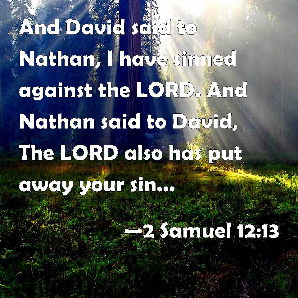 Choose a Background 2 Samuel 12:13 And David said to Nathan, I have sinned against the LORD. And Nathan said to David, The LORD also has put away your sin; you shall not die. KJV: And David said unto Nathan, I have sinned against the LORD. And Nathan said unto David, The LORD also hath put away thy sin; thou shalt not die. DRB: And David said to Nathan: I have sinned against the Lord. And Nathan said to David: The Lord also hath taken away thy sin: thou shalt not die. DBT: And David said to Nathan, I have sinned against Jehovah. And Nathan said to David, Jehovah has also put away thy sin: thou shalt not die. ERV: And David said unto Nathan, I have sinned against the LORD. And Nathan said unto David, The LORD also hath put away thy sin; thou shalt not die. WBT: And David said to Nathan, I have sinned against the LORD. And Nathan said to David, The LORD also hath put away thy sin; thou shalt not die. WEB: David said to Nathan, "I have sinned against Yahweh." Nathan said to David, "Yahweh also has put away your sin. You will not die. YLT: And David saith unto Nathan, 'I have sinned against Jehovah.' And Nathan saith unto David, 'Also — Jehovah hath caused thy sin to pass away; thou dost not die;Links 2 Samuel 12:13 NIV • 2 Samuel 12:13 NLT • 2 Samuel 12:13 ESV • 2 Samuel 12:13 NASB • 2 Samuel 12:13 KJV • 2 Samuel 12:13 Interlinear • 2 Samuel 12:13 Commentaries • 2 Samuel 12:13 Parallel Texts • 2 Samuel 12:13 Bible Apps • 2 Samuel 12:13 Parallel • Bible Hub |