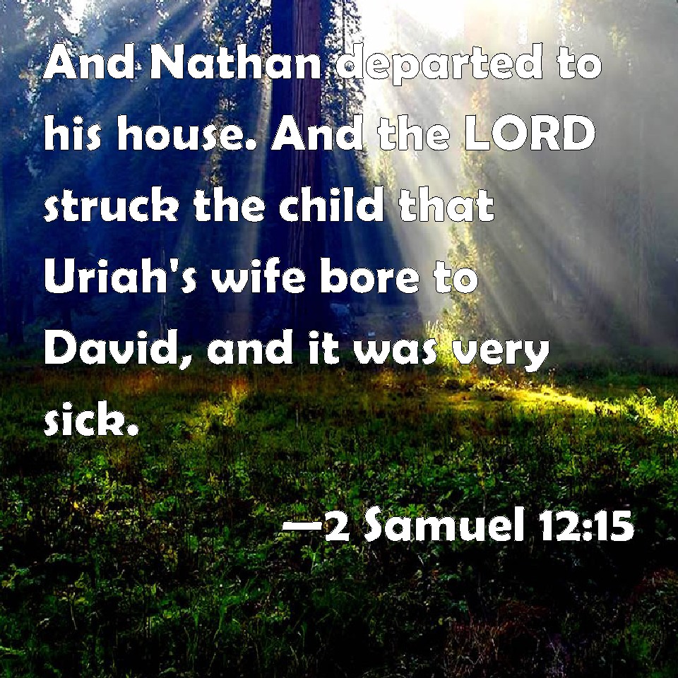 Choose a Background 2 Samuel 12:15 And Nathan departed to his house. And the LORD struck the child that Uriah's wife bore to David, and it was very sick. KJV: And Nathan departed unto his house. And the LORD struck the child that Uriah's wife bare unto David, and it was very sick. DRB: And Nathan returned to his house. The Lord also struck the child which the wife of Urias had borne to David, and his life was despaired of. DBT: And Nathan departed to his house. And Jehovah smote the child that Urijah's wife bore to David, and it became very sick. ERV: And Nathan departed unto his house. And the LORD struck the child that Uriah's wife bare unto David, and it was very sick. WBT: And Nathan departed to his house. And the LORD struck the child that Uriah's wife bore to David, and it was very sick. WEB: Nathan departed to his house. Yahweh struck the child that Uriah's wife bore to David, and it was very sick. YLT: And Nathan goeth unto his house, and Jehovah smiteth the lad, whom the wife of Uriah hath born to David, and it is incurable;Links 2 Samuel 12:15 NIV • 2 Samuel 12:15 NLT • 2 Samuel 12:15 ESV • 2 Samuel 12:15 NASB • 2 Samuel 12:15 KJV • 2 Samuel 12:15 Interlinear • 2 Samuel 12:15 Commentaries • 2 Samuel 12:15 Parallel Texts • 2 Samuel 12:15 Bible Apps • 2 Samuel 12:15 Parallel • Bible Hub |